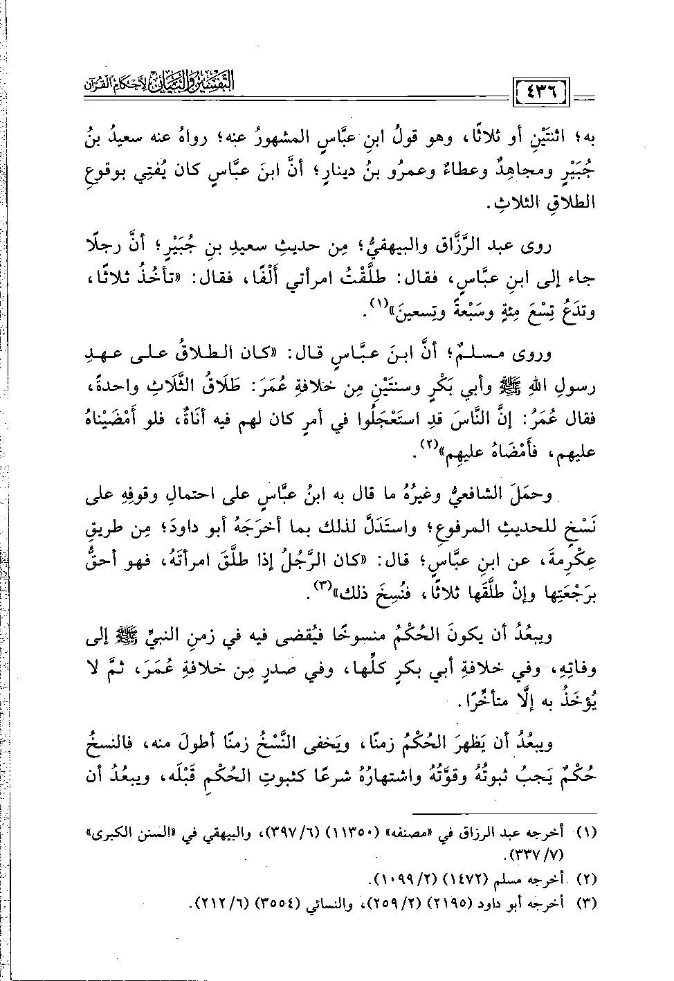 وحمَلَ الشافعيُّ وغيرُهُ ما قال به ابنُ عبَّاسٍ على احتمالِ وقوفِهِ على نَسْخٍ للحديثِ المرفوعِ؛ واستَدَلَّ لذلك بما أخرَجَهُ أبو داودَ؛ مِن طريقِ عِكْرِمةَ، عن ابنِ عبَّاسٍ؛ قال: "كان الرَّجُلُ إذا طلَّقَ امرأتَهُ، فهو أحقُّ برَجْعَتِها وإنْ طلَّقَها ثلاثًا، فنُسِخَ ذلك" (٣).