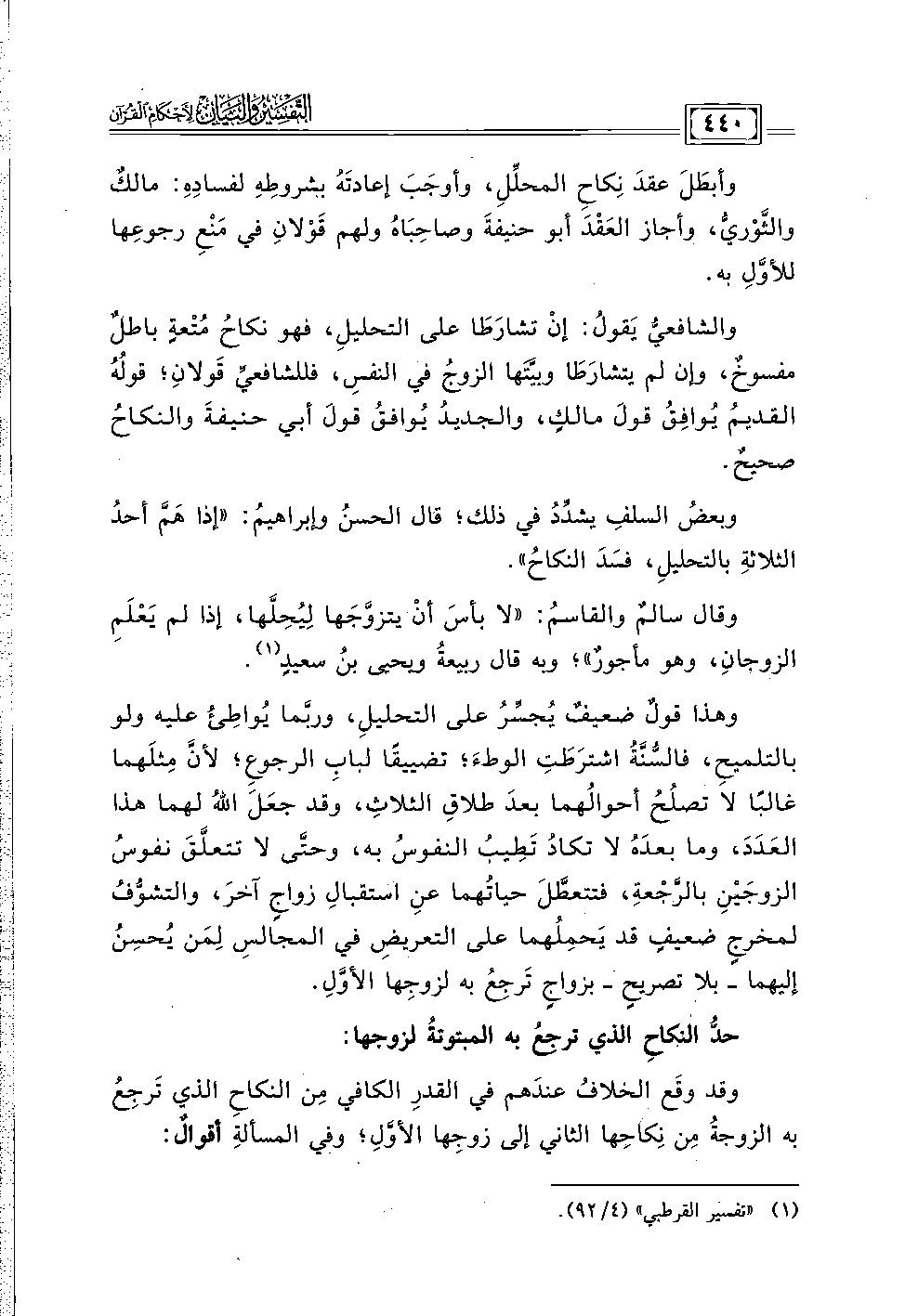 وأبطَلَ عقدَ نِكاحِ المحلِّلِ، وأوجَبَ إعادتَهُ بشروطِهِ لفسادِهِ: مالكٌ والثَّوْريُّ، وأجاز العَقْدَ أبو حنيفةَ وصاحِبَاهُ ولهم قَوْلانِ في مَنْعِ رجوعِها للأوَّلِ به.