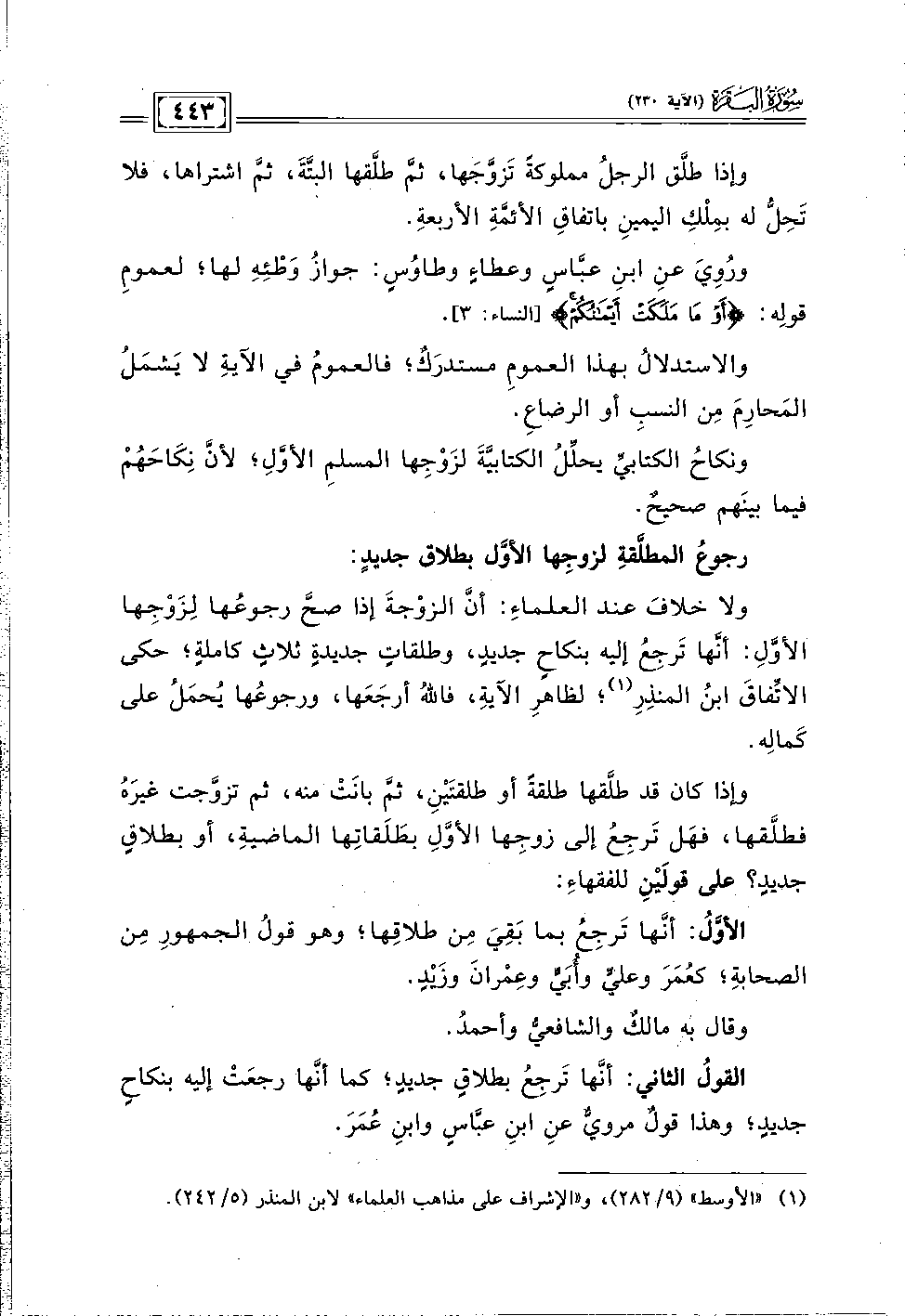 ولا خلافَ عند العلماءِ: أنَّ الزوْجةَ إذا صحَّ رجوعُها لِزَوْجِها الأوَّلِ: أنَّها تَرجِعُ إليه بنكاحٍ جديدٍ، وطلقاتٍ جديدةٍ ثلاثٍ كاملةٍ؛ حكى الاتِّفاقَ ابنُ المنذِرِ (١)؛ لظاهرِ الآيةِ، فاللهُ أرجَعَها، ورجوعُها يُحمَلُ على كَمالِه.