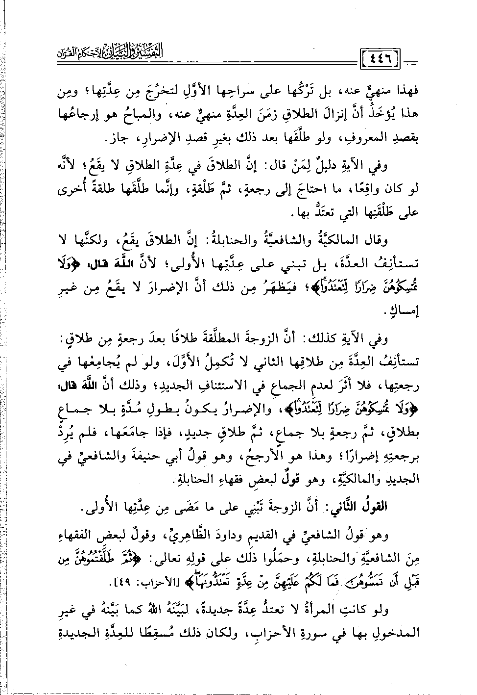 وفي الآيةِ كذلك: أنَّ الزوجةَ المطلَّقةَ طلاقًا بعدَ رجعةٍ مِن طلاقٍ: تستأنِفُ العِدَّةَ مِن طلاقِها الثاني لا تُكمِلُ الأَوَّلَ، ولو لم يُجامِعْها في رجعتِها، فلا أثَرَ لعدمِ الجماعِ في الاستئنافِ الجديدِ؛ وذلك أنَّ اللهَ قال: {وَلَا تُمْسِكُوهُنَّ ضِرَارًا لِتَعْتَدُوا}، والإضرارُ يكونُ بطولِ مُدَّةٍ بلا جماعٍ بطلاقٍ، ثم رجعةٍ بلا جماعٍ، ثمَّ طلاقٍ جديدٍ، فإذا جامَعَها، فلم يُرِدْ برجعتِهِ إضرارًا؛ وهذا هو الأرجحُ، وهو قولُ أبي حنيفةَ والشافعيِّ في الجديدِ والمالكيَّةِ، وهو قولٌ لبعضِ فقهاءِ الحنابلةِ.