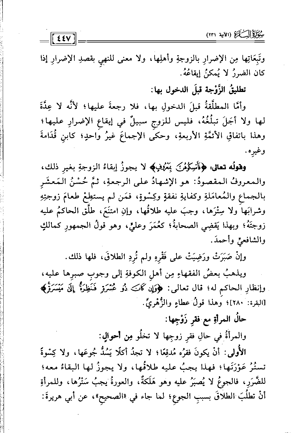وقولُه تعالى: {فَأَمْسِكُوهُنَّ بِمَعْرُوفٍ} لا يجوز إبقاءُ الزوجةِ بغيرِ ذلك، والمعروفُ المقصودُ: هو الإشهادُ على الرجعةِ، ثمَّ حُسْنُ المَعشَرِ بالجماعِ والمُعامَلةِ وكفايةِ نفقةٍ وكِسْوةٍ، فمَن لم يستطِعْ طعامَ زوجتِهِ وشرابَها ولا سِتْرَها، وجبَ عليه طلاقُها، وإنِ امتَنَعَ، طلَّق الحاكمُ عليه زوجتَهُ؛ وبهذا يَقضِي الصحابةُ؛ كعُمَرَ وعليٍّ، وهو قولُ الجمهورِ كمالكٍ والشافعيِّ وأحمدَ.