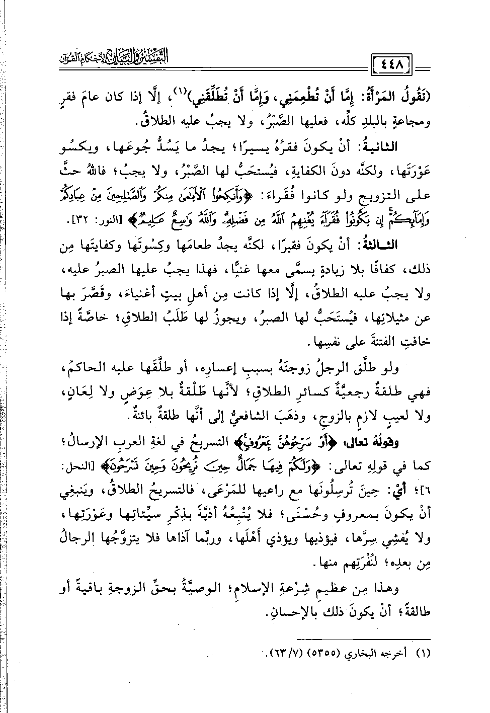 الثالثةُ: أنْ يكونَ فقيرًا، لكنَّه يجدُ طعامَها وكِسْوتَها وكفايتَها مِن ذلك، كفافًا بلا زيادةٍ يسمَّى معها غنيًّا، فهذا يجبُ عليها الصبرُ عليه، ولا يجبُ عليه الطلاقُ، إلَّا إذا كانت مِن أهلِ بيتٍ أغنياءَ، وقَصَّرَ بها عن مثيلاتِها، فيُستَحَبُّ لها الصبرُ، ويجوزُ لها طَلَبُ الطلاقِ؛ خاصَّةً إذا خافتِ الفتنةَ علي نفسِها.