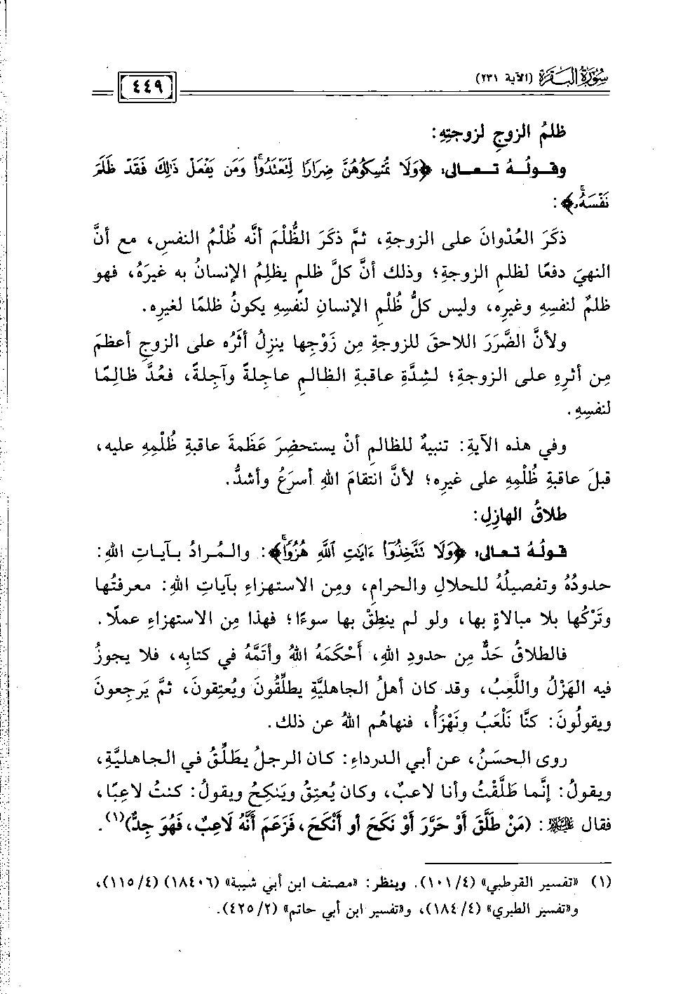 ذكَرَ العُدْوانَ علي الزوجةِ، ثمَّ ذكَرَ الظُّلْمَ أنَّه ظُلْمُ النفسِ، مع أنَّ النهيَ دفعًا لظلمِ الزوجةِ؛ وذلك أنَّ كلَّ ظلمٍ يظلِمُ الإنسانُ به غيرَهُ، فهو ظلمٌ لنفسِهِ وغيرِه، وليس كلُّ ظُلْمِ الإنسانِ لنفسِهِ يكونُ ظلمًا لغيرِه.