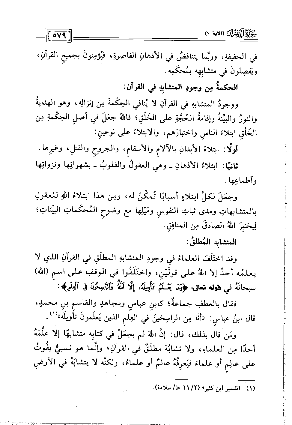 وقد اختَلَفَ العلماءُ في وجودِ المتشابهِ المطلَقِ في القرآن الذي لا يعلمُه أحدٌ إلا اللهُ على قولَيْنِ، واختَلَفُوا في الوقفِ على اسمِ (الله) سبحانَهُ في قوله تعالى: {وَمَا يَعْلَمُ تَأْوِيلَهُ إِلَّا اللَّهُ وَالرَّاسِخُونَ فِي الْعِلْمِ}: