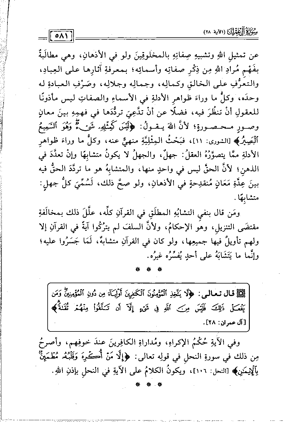 عن تمثيلِ اللهِ وتشبيهِ صِفاتِهِ بالمخلوقِينَ ولو في الأذهانِ، وهي مطالَبةٌ بفَهْمِ مُرادِ اللهِ مِن ذِكْرِ صفاتِه وأسمائِه؛ بمعرفةِ آثارِها على العِبادِ، والتعرُّفِ على الخالقِ وكمالِه، وجمالِه وجلالِه، وصَرْفِ العبادةِ له وحدَه، وكلُّ ما وراءَ ظواهرِ الأدلةِ في الأسماءِ والصفاتِ ليس مأذونًا للعقولِ أنْ تنظُرَ فيه، فضلًا عن أنْ تدَّعِىَ تردُّدَها في فهمهِ بينَ معانٍ وصورٍ محصورةٍ؛ لأنَّ اللهَ يقولُ: {لَيْسَ كَمِثْلِهِ شَيْءٌ وَهُوَ السَّمِيعُ الْبَصِيرُ} [الشورى: ١١]، ، فبَحْثُ المِثْلِيَّةِ منهيٌّ عنه، وكلُّ ما وراءَ ظواهرِ الأدلةِ ممَّا يتصوَّرُهُ العقلُ: جهلٌ، والجهلُ لا يكونُ متشابِهًا وإنْ تعدَّدَ في الذهنِ؛ لأنَّ الحقَّ ليس في واحدٍ منها، والمتشابِهُ هو ما تردَّدَ الحقُّ فيه بينَ عِدَّةِ مَعَانٍ مُنقدِحةٍ في الأذهانِ، ولو صحَّ ذلك، لَسُمِّيَ كلُّ جهلٍ: متشابِهًا.