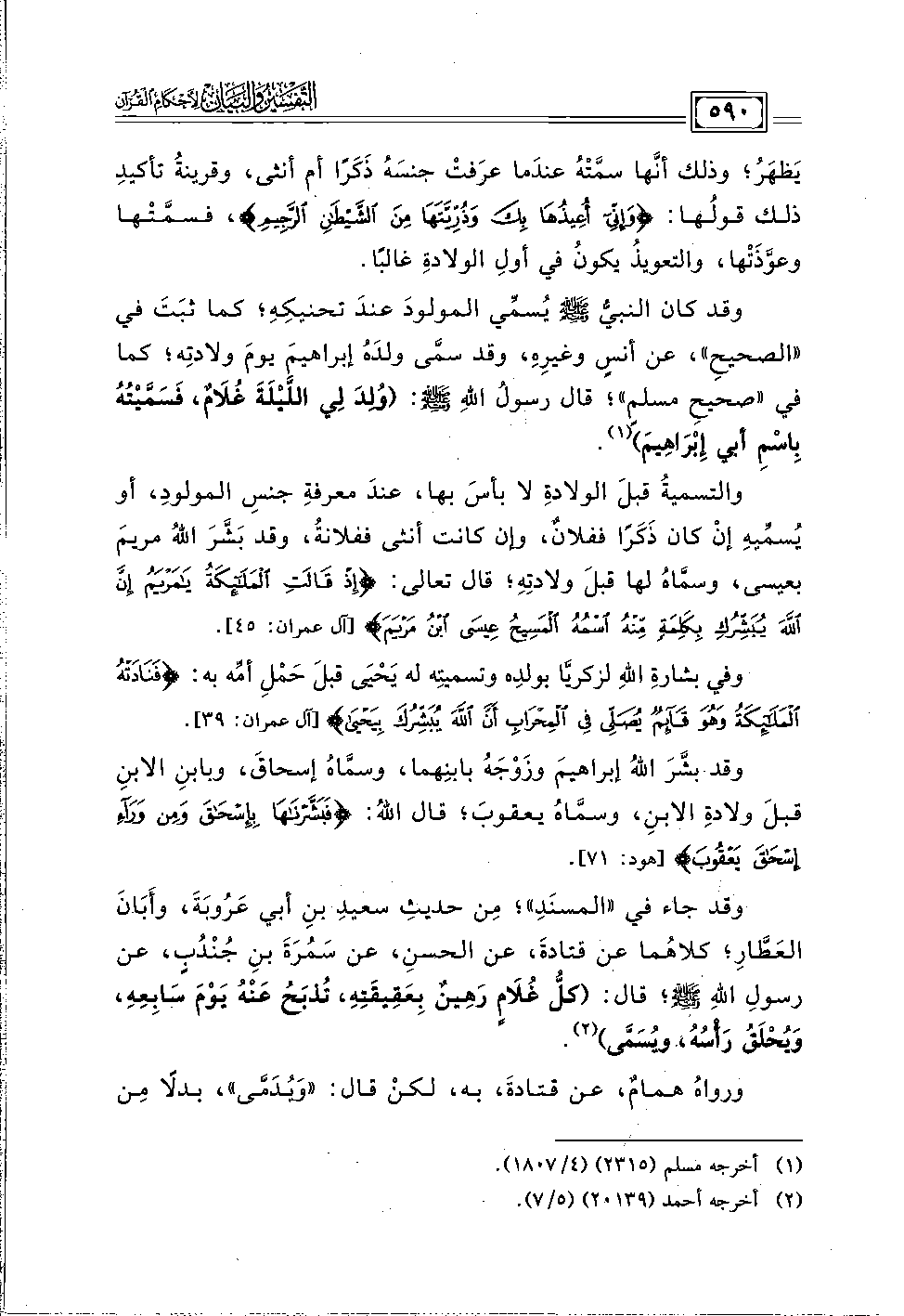 وقد كان النبيُّ - صلى الله عليه وسلم - يُسمِّي المولودَ عدَ تحنيكِهِ؛ كما ثبَتَ في "الصحيحِ"، عن أنسٍ وغيرِهِ، وقد سمَّى ولدَهُ إبراهيمَ يومَ ولادتِه؛ كما في "صحيحِ مسلمٍ"؛ قال رسولُ اللهِ - صلى الله عليه وسلم -: (وُلِدَ لِي اللَّيْلَةَ غُلَامٌ، فَسَمَّيْتُهُ بِاسْمِ أبي إِبْرَهِيمَ) (١).