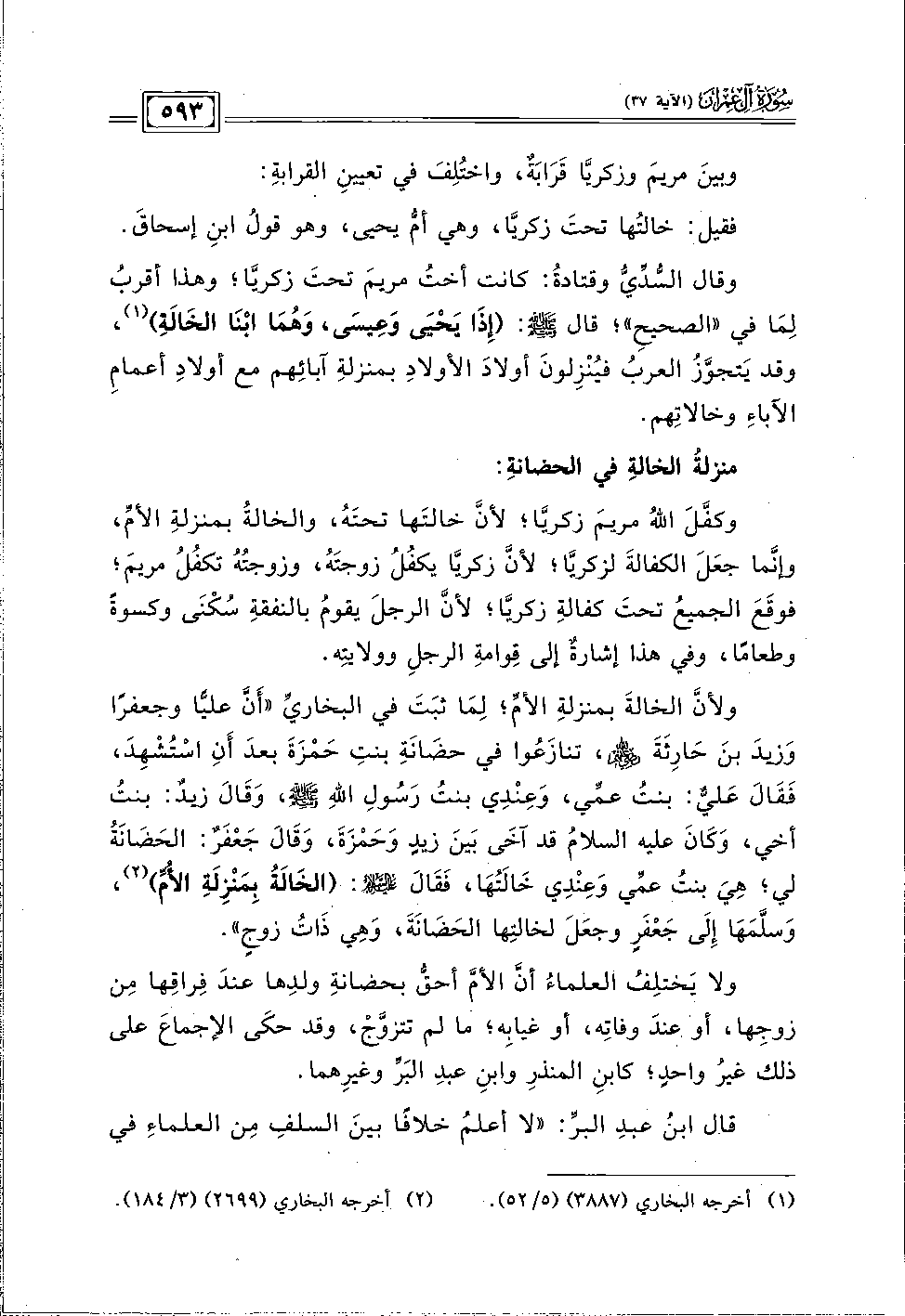 ولأنَّ الخالةَ بمنزلةِ الأمِّ؛ لِمَا ثبَتَ في البخاريِّ "أَنَّ عليًّا وجعفرًا وَزيدَ بنَ حَارِثَةَ - رضي الله عنهم -، تنازَعُوا في حضَانَةِ بنتِ حَمْزَةَ بعدَ أَنِ اسْتُشْهِدَ، فَقَالَ عَليٌّ: بنتُ عمِّي، وَعِنْدِي بنتُ رَسُولِ اللهِ - صلى الله عليه وسلم -، وَقَالَ زيدٌ: بنتُ أخي، وَكَانَ عليه السلامُ قد آخَى بَينَ زيدٍ وَحَمْزَةَ، وَقَالَ جَعْفَرٌ: الحَضَانَةُ لي؛ هِيَ بنتُ عمِّي وَعِنْدِي خَالَتُهَا، فَقَالَ - عليه السلام -: (الخَالَةُ بِمَنْزِلَةِ الأُمِّ) (٢)، وَسلَّمَهَا إِلَى جَعْفَرٍ وجعَلَ لخالتِها الحَضَانَةَ، وَهِي ذَاتُ زوجٍ".