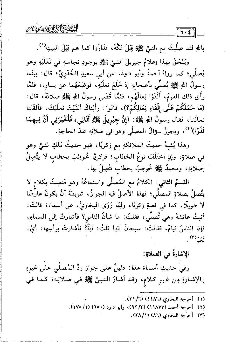 وَيلحَقُ بهذا إعلامُ جبريلَ النبيَّ - صلى الله عليه وسلم - بوجودِ نجاسةٍ في نَعْلَيْهِ وهو يُصلِّي؛ كما رواهُ أحمدُ وأبو داودَ، عن أبي سعيدٍ الخُدْرِيِّ؛ قال: بينَما رسولُ اللهِ - صلى الله عليه وسلم - يُصلِّي بأصحابِهِ إذ خَلَعَ نعلَيْهِ، فوضَعَهُما عن يسارِه، فلمَّا رأى ذلك القومُ، أَلْقَوْا نِعالَهُم، فلما قَضَى رسول اللهِ - صلى الله عليه وسلم - صلاتَهُ، قال: (مَا حَمَلَكُمْ عَلَى إِلْقَاءِ نِعَالِكُمْ؟ )، قالوا: رأَيْناكَ ألقَيْتَ نعلَيْكَ، فألقَيْنا نعالَنا، فقال رسولُ اللهِ - صلى الله عليه وسلم -: (إِنَّ جِبْرِيلَ - صلى الله عليه وسلم - أَتَانِي، فَأَخْبَرَنِي أَنَّ فِيهِمَا قَذَرًا) (٢)، ويجوزُ سؤالُ المصلِّي وهو في صلاتِه عندَ الحاجةِ.