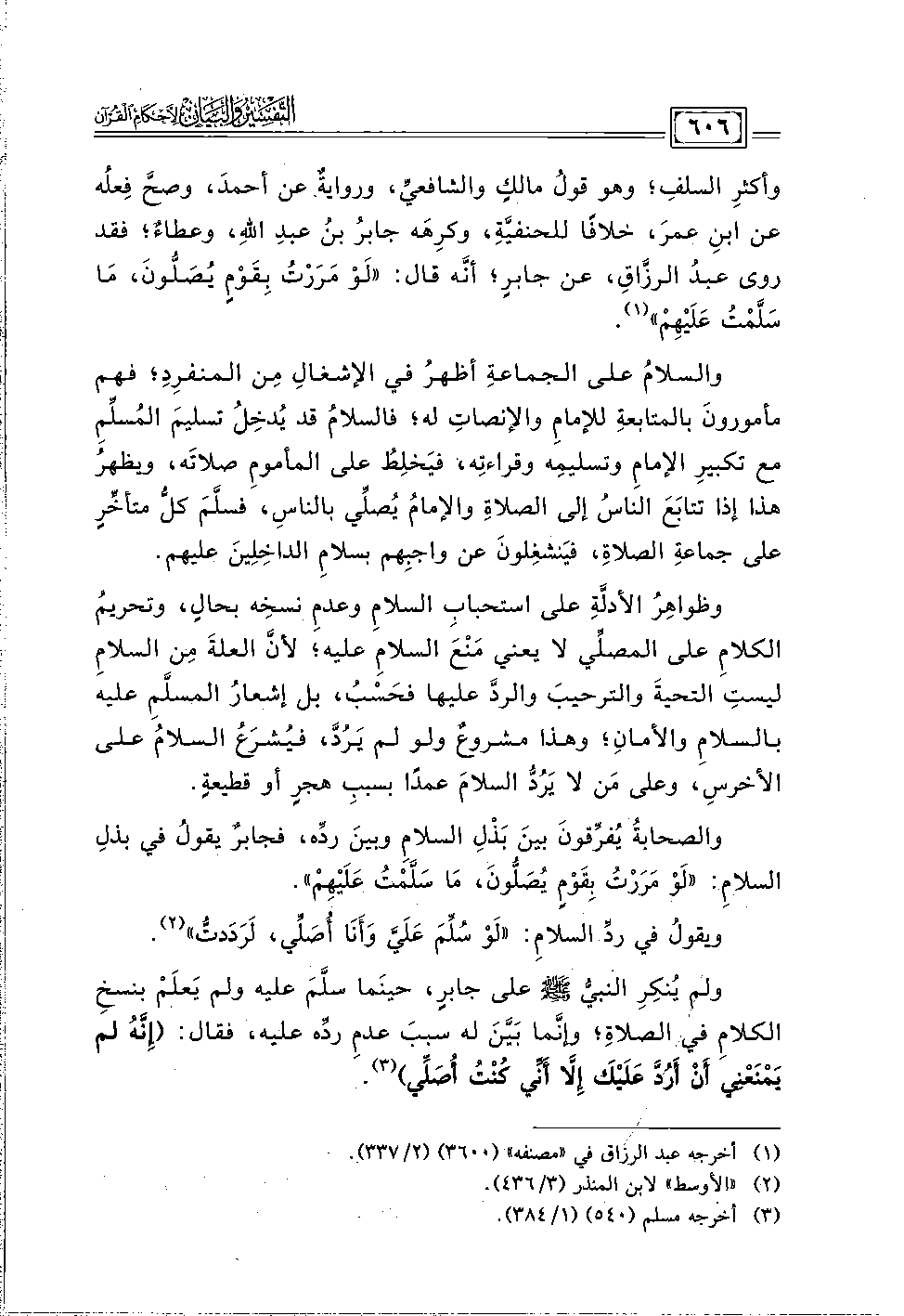وأكثرِ السلفِ؛ وهو قولُ مالكٍ والشافعيِّ، وروايةٌ عن أحمدَ، وصحَّ فِعلُه عن ابنِ عمرَ، خلافًا للحنفيَّةِ، وكرِهَه جابرُ بن عبدِ اللهِ، وعطاءٌ؛ فقد روى عبدُ الرزَّاقِ، عن جابرٍ؛ أنَّه قال: "لَوْ مَرَرْتُ بِقَوْمِ يُصَلُّونَ، مَا سَلَّمْتُ عَلَيْهِمْ" (١).
