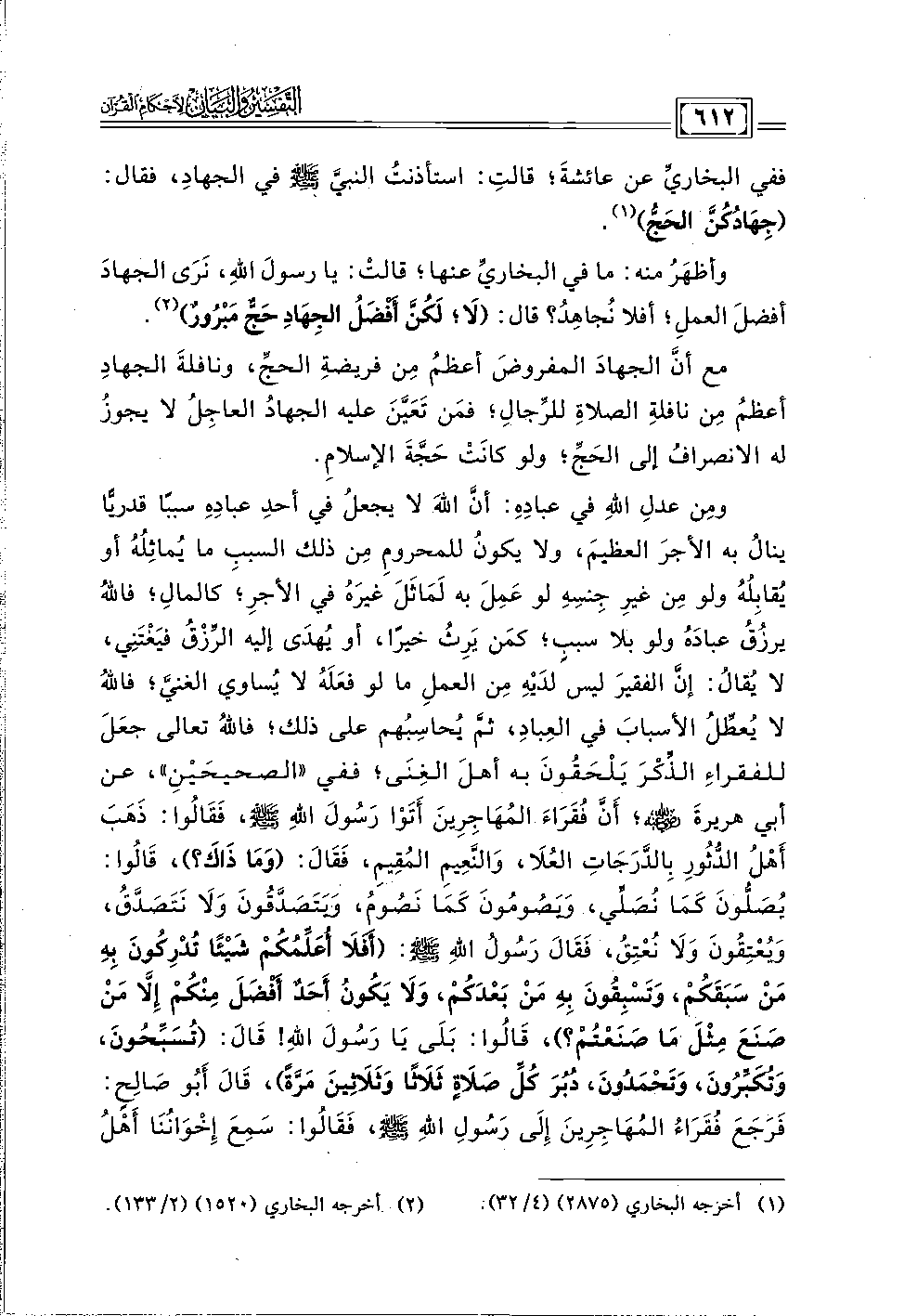 وأظهَرُ منه: ما في البخاريِّ عنها؛ قالتْ: يا رسولَ اللهِ، نَرَى الجهادَ أفضلَ العملِ؛ أفلا نُجاهِدُ؟ قال: (لَا؛ لَكُنَّ أَفْضَلُ الجِهَادِ حَجٌّ مَبْرُورٌ) (٢).