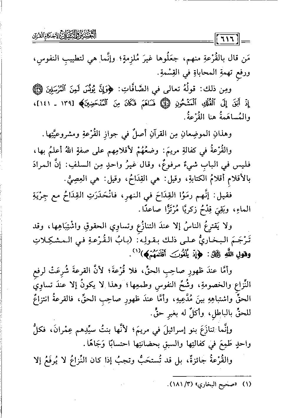 ولا يَقترِعُ الناسُ إلا عندَ التنازُعِ وتساوِي الحقوقِ واشْتِبَاهِها، وقد تَرْجَمَ البخاريُّ على ذلك بقولِه: (باب القُرْعةِ في المشكِلاتِ وقولِ اللهِ - عز وجل -: {إِذْ يُلْقُونَ أَقْلَامَهُمْ}) (١).