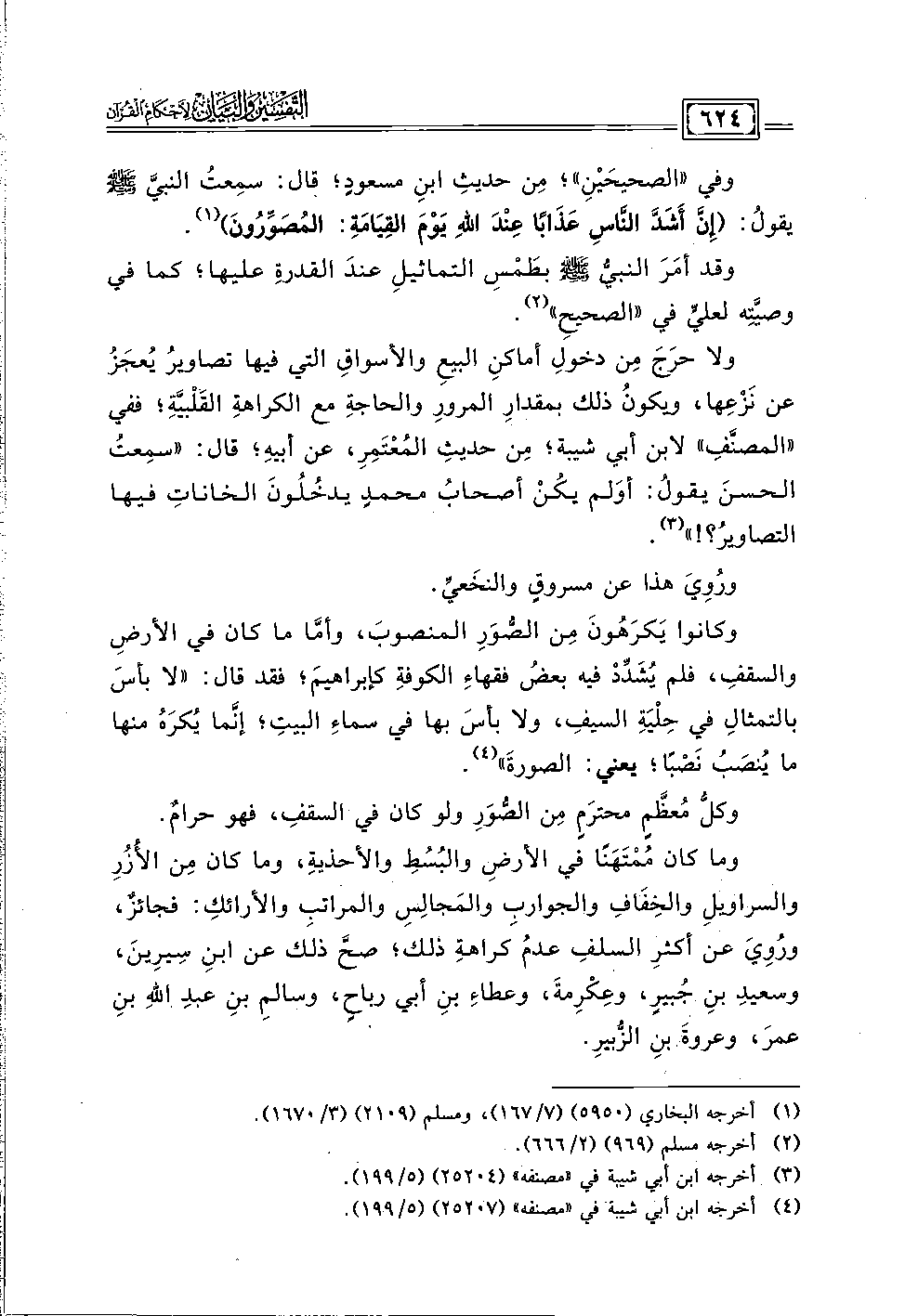 وفي "الصحيحَيْنَ"؛ مِن حديثِ ابنِ مسعودٍ؛ قال: سمِعتُ النبيَّ - صلى الله عليه وسلم - يقولُ: (إِنَّ أَشدَّ النَّاسِ عَذَابًا عِنْدَ اللهِ يَوْمَ القِيَامَةِ: المُصَوِّرُونَ) (١).
