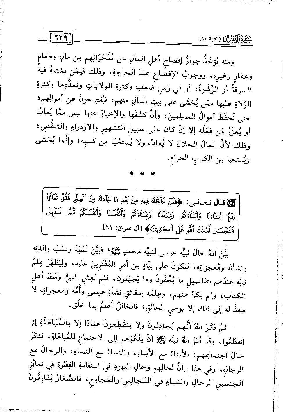 ثمَّ ذكَرَ اللهُ أنَّهم يُجادِلونَ ولا ينقَطِعونَ عنادًا إلا بالمُبَاهَلَةِ إنِ انقطَعوا, وقد أمَرَ اللهُ نبيَّه - صلى الله عليه وسلم - أنْ يدْعُوَهم إلى الاجتماعِ للمُباهَلةِ, فذكَرَ حالَ اجتماعهم: الأبناءُ مع الأبناءِ, والنساءُ مع النساءِ, والرجالُ مع الرجالِ, وفي هذا بيانٌ لحالِهم وحالِ اليهودِ في استقامةِ الفِطْرةِ في تمايُزِ الجنسينِ الرجالِ والنساءِ في المَجالِسِ والمَجامِعِ, فالصِّغارُ يُفارِقُونَ