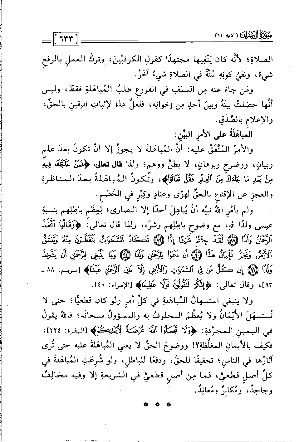 ولا ينبغي استسهالُ المُباهَلةِ في كلِّ أمرٍ ولو كان قطعيًّا؛ حتى لا تُسَتسهَلَ الأَيْمَانُ ولا يُعظَّمَ المحلوفُ به والمسؤولُ سبحانَه، فاللهُ يقولُ في اليمينِ المجرَّدةِ: {وَلَا تَجْعَلُوا اللَّهَ عُرْضَةً لِأَيْمَانِكُمْ} [البقرة: ٢٢٤] , فكيف بالأيمانِ المغلَّظةِ؟ ! ووضوحُ الحقِّ لا يعني المُباهَلةَ عيه حتى تُرى آثارُها في الناسِ؛ تحقيقًا للحقِّ، ودفعًا للباطلِ، ولو شُرِعَتِ المُباهَلةُ في كلِّ أصلٍ قطعيٍّ، فما مِن أصلٍ قطعيٍّ في الشريعةِ إلا وفيه مخالِفٌ وجاحِدٌ، ومُكابِرٌ ومُعانِدٌ.