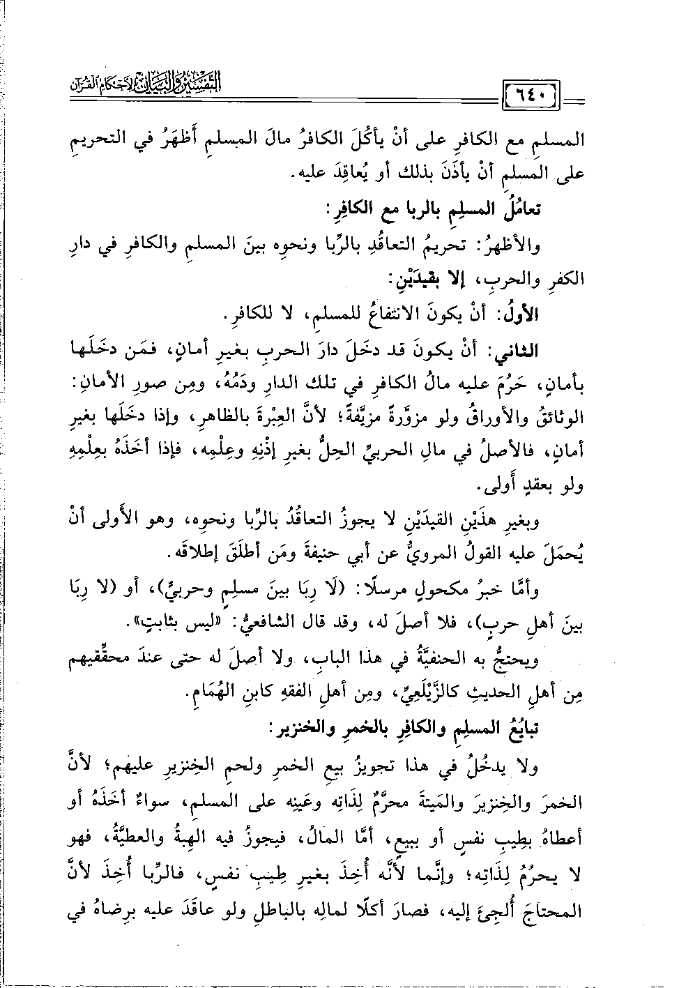 ولا يدخُل في هذا تجويزُ بيع الخمرِ ولحمِ الخِنزيرِ عليهم؛ لأن الخمرَ والخِنزيرَ والمَيتة محرَّمٌ لِذَاتِه وعَينه على المسلمِ، سواءٌ أخَذَهُ أو أعطاهُ بطِيبِ نفسٍ أو ببيعٍ، أما المالُ، فيجوزُ فيه الهِبةُ والعطيةُ، فهو لا يحرُمُ لِذَاتِه؛ وإنما لأنه أخِذَ بغيرِ طيب نفسٍ، فالربا أخِذَ لأن المحتاجَ أُلجِئَ إليه، فصارَ أكلًا لمالِه بالباطلِ ولو عاقَدَ عليه برِضاهُ في