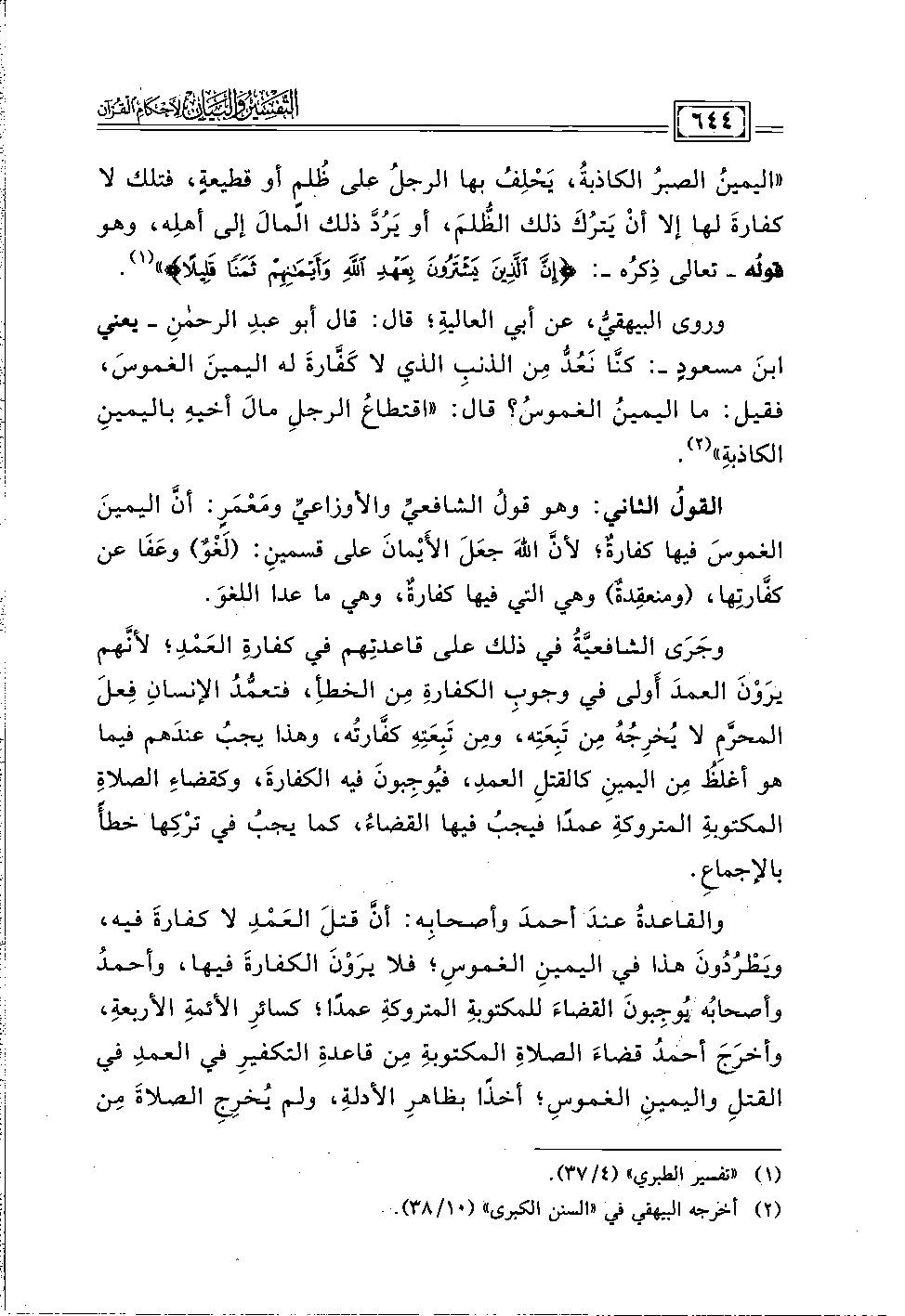 "اليمينُ الصبرُ الكاذبةُ، يَحْلِفُ بها الرجلُ على ظُلمٍ أو قطيعةٍ، فتلك لا كفارةَ لها إلا أن يَترُكَ ذلك الظلمَ، أو يَرُدَّ ذلك المالَ إلى أهلِه، وهو قوله - تعالى ذِكرُه -: {إِنَّ الَّذِينَ يَشْتَرُونَ بِعَهْدِ اللَّهِ وَأَيْمَانِهِمْ ثَمَنًا قَلِيلًا} " (١).