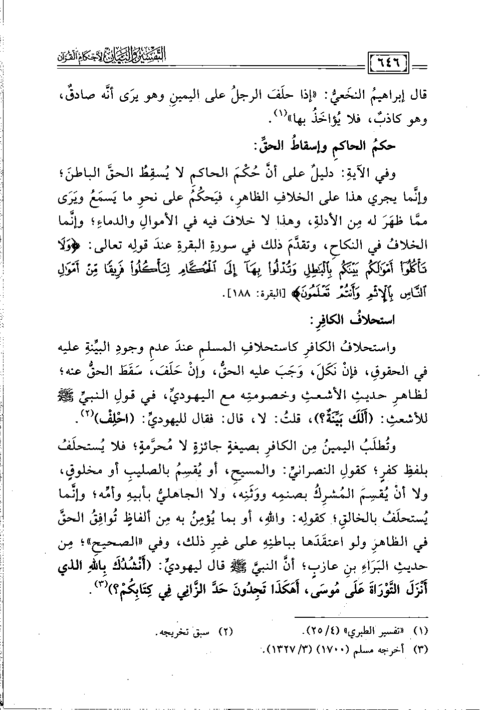 واستحلافُ الكافر كاستحلافِ المسلم عندَ عدمِ وجودِ البينة عليه في الحقوق، فإنْ نَكَلَ، وَجَبَ عليه الحقُّ، وإن حَلَفَ، سَقطَ الحقُّ عنه، لظاهرِ حديثِ الأشعثِ وخصومتِه مع اليهوديِّ، في قولِ النبي - صلى الله عليه وسلم - للأشعثِ؟ (أَلكَ بَيِّنَةٌ؟ )، قلتُ: لا، قال؛ فقال لليهوديِّ: (احلِف) (٢).