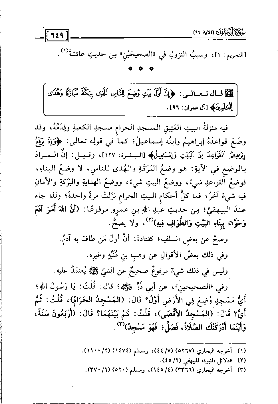 فيه منزلة البيت العَتيقِ المسجدِ الحرام مسجدِ الكعبةِ وقدَمُه، وقد وضعَ قواعدَة إبراهيمُ وابنه إسماعيلُ، كما في قولِه تعالى: {وَإِذْ يَرْفَعُ إِبْرَاهِيمُ الْقَوَاعِدَ مِنَ الْبَيْتِ وَإِسْمَاعِيلُ} [البقرة: ١٢٧]، وقيل: إنَّ المرادَ بالوضعِ في الآيةِ: هو وضع البَرَكَةِ والهُدى للناسِ، لا وضعُ البناءِ، فوضعُ القواعدِ شيءٌ، ووضع البيتِ شيءٌ، ووضعُ الهدايةِ والبَرَكةِ والأمانِ فيه شيء آخَرُ؛ فما كل أحكامِ البيتِ الحرامِ نزَلت مرةً واحدةً؛ ولذا جاء عندَ البيهقي؛ مِن حديثِ عبدِ اللهِ بنِ عمرٍو مرفوعًا: (أن اللهَ أمرَ آدَمَ وَحَوَّاء بِبِنَاءِ البَيتِ وَالطَوَافِ فِيهِ) (٢)، ولا يصح.