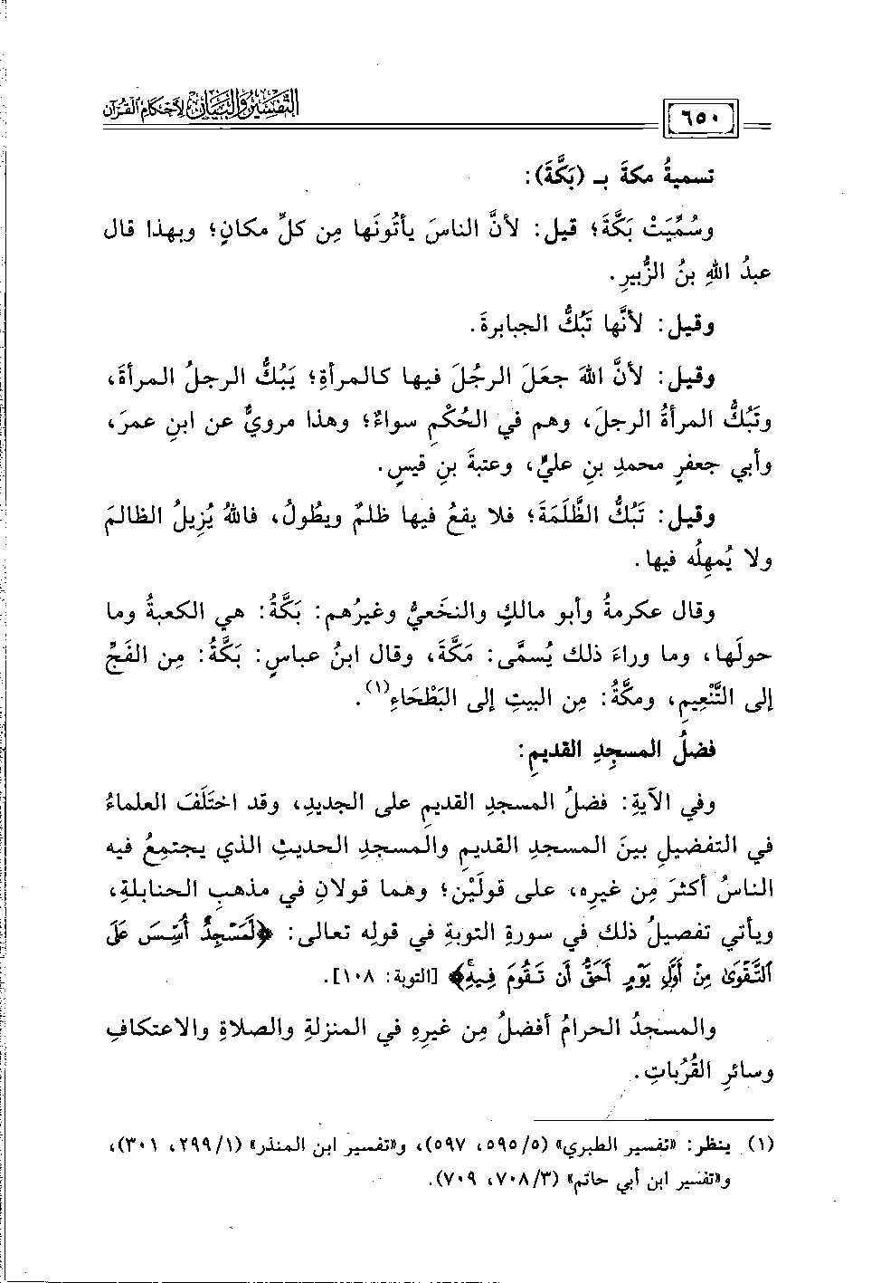 وقال عكرمةُ وأبو مالكٍ والنخَعي وغيرهم: بَكَّةُ, هي الكعبة وما حولَها، وما وراءَ ذلك يُسمى: مَكةَ، وقال ابنُ عباسٍ: بَكَةُ: مِن الفَجِّ إلى التنعيمِ، ومكة: مِن البيتِ إلى البَطحَاءِ (١).