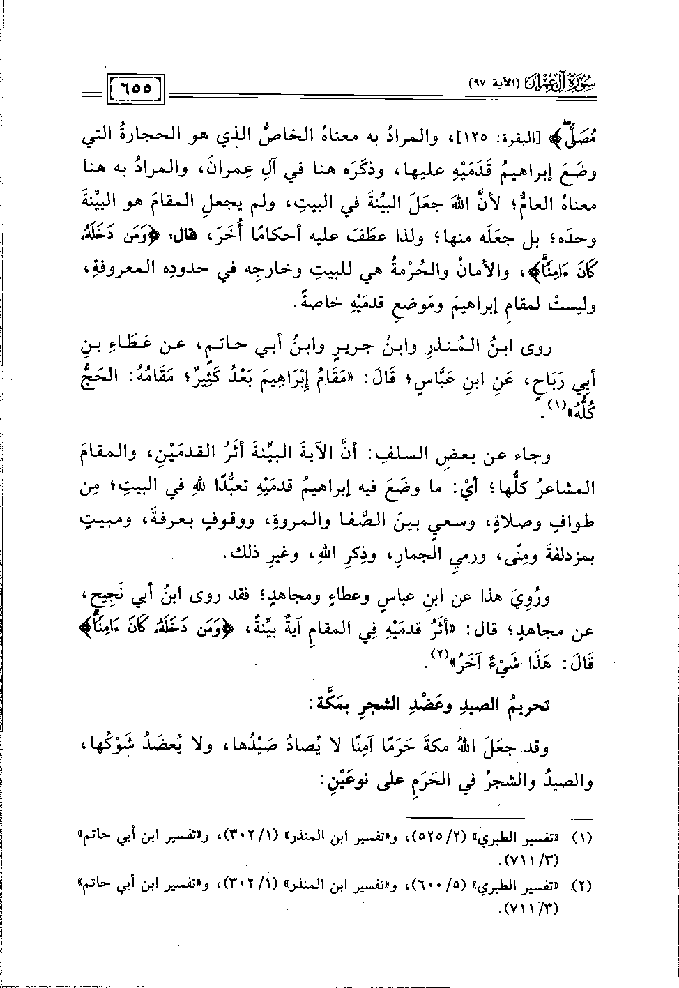 مُصَلًّى} [البقرة: ١٢٥] , والمرادُ له معناهُ الخاص الذي هو الحجارة التي وضعَ إبراهيم قدَمَيهِ عليها، وذكَرَه هنا في آلِ عِمرانَ، والمرادُ به ها معناهُ العام, لأنَّ اللهَ جعَلَ البينة في البيت، ولم يجعلِ المقامَ هو البينةَ وحدَه، بل جعلَه منها؛ ولذا عطَفَ عليه أحكاما أخَرَ، قال: {وَمَنْ دَخَلَهُ كَانَ آمِنًا}، والأمانُ والحرمة هي للبيتِ وخارجِه في حدودِه المعروفة، وليست لمقام إبراهيم ومَوضعِ قدمهِ خاصةً.
