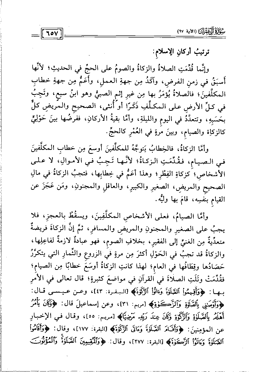 وأمَّا الصيامُ، فعلى الأشخاصِ المكلَّفِينَ، ويسقُطُ بالعجزِ، فلا يجبُ على الصغيرِ والمجنونِ والمريضِ والمسافرِ، ثمَّ إنَّ الزكاةَ فريضةٌ متعدِّيةٌ مِن الغنيِّ إلى الفقير، بخلافِ الصوم، فهو عبادةٌ لازمةٌ لفاعِلِها، والزكاةُ قد تجبُ في الحَوْلِ أكثرَ مِن مرةٍ في الزروعِ والثِّمارِ التي يتكرَّرُ حَصَادُها وقِطَافُها في العامِ؛ لهذا كانتِ الزكاةُ أوسَعَ خطابًا مِن الصيامِ؛ فقُدِّمَتْ وتَلَتِ الصلاةَ في القرآنِ في مواضعَ كثيرةٍ؛ قال تعالى في الأمرِ بها: {وَأَقِيمُوا الصَّلَاةَ وَآتُوا الزَّكَاةَ} [البقرة: ٤٣]، وعن عيسى قال: {وَأَوْصَانِي بِالصَّلَاةِ وَالزَّكَاةِ} [مريم: ٣١]، وعن إسماعيلَ قال: {وَكَانَ يَأْمُرُ أَهْلَهُ بِالصَّلَاةِ وَالزَّكَاةِ وَكَانَ عِنْدَ رَبِّهِ مَرْضِيًّا} [مريم: ٥٥]، وقال في الإخبارِ عن المؤمِنينَ: {وَأَقَامَ الصَّلَاةَ وَآتَى الزَّكَاةَ} [البقرة: ١٧٧]، وقال: {وَأَقَامُوا الصَّلَاةَ وَآتَوُا الزَّكَاةَ} [البقرة: ٢٧٧]، وقال: {وَالْمُقِيمِينَ الصَّلَاةَ وَالْمُؤْتُونَ