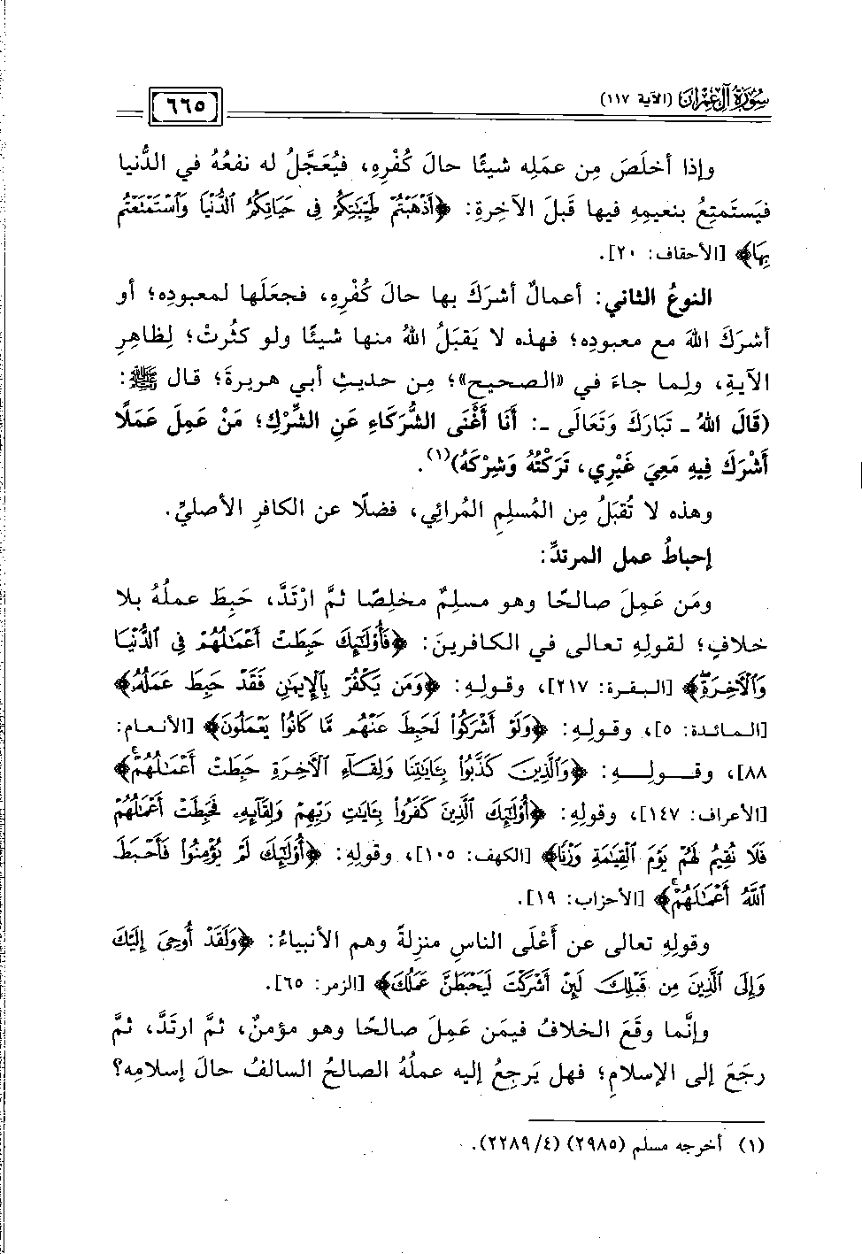 النوعُ الثاني: أعمالٌ أشرَكَ بها حالَ كُفْرِه، فجعَلَها لمعبودِه؛ أو أشرَكَ اللهَ مع معبودِه؛ فهذه لا يَقبَلُ الله منها شيئًا ولو كثُرتْ؛ لِظاهِرِ الآية، ولِما جاءَ في "الصحيح"؛ مِن حديثِ أبي هريرةَ؛ قال - صلى الله عليه وسلم -: (قَالَ الله - تَبَارَكَ وَتَعَالَى -: أَنَا أَغْنَى الشُّرَكَاءِ عَنِ الشِّرْكِ؛ مَنْ عَمِلَ عَمَلًا أَشْرَكَ فِيهِ مَعِيَ غَيْرِي، تَرَكْتُهُ وَشِرْكَهُ) (١).