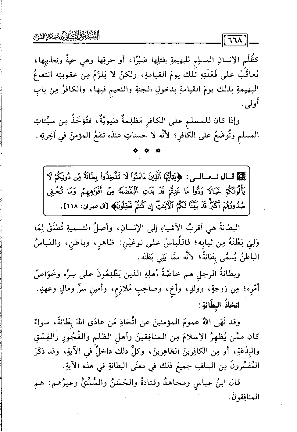 وقد نَهَى الله عمومَ المؤمنينَ عن اتِّخاذِ مَن عادَى اللهَ بِطَانةً، سواءٌ كان ممَّن يُظهِرُ الإِسلامَ مِن المنافِقينَ وأهلِ الظلمِ والفُجُورِ والفِسْقِ والبِدْعَةِ، أو مِن الكافِرينَ الظاهِرينَ، وكلُّ ذلك داخلٌ في الآية، وقد ذكَرَ المُفسِّرونَ مِن السلفِ جميعَ ذلك في معنَى البطانةِ في هذه الآيةِ.