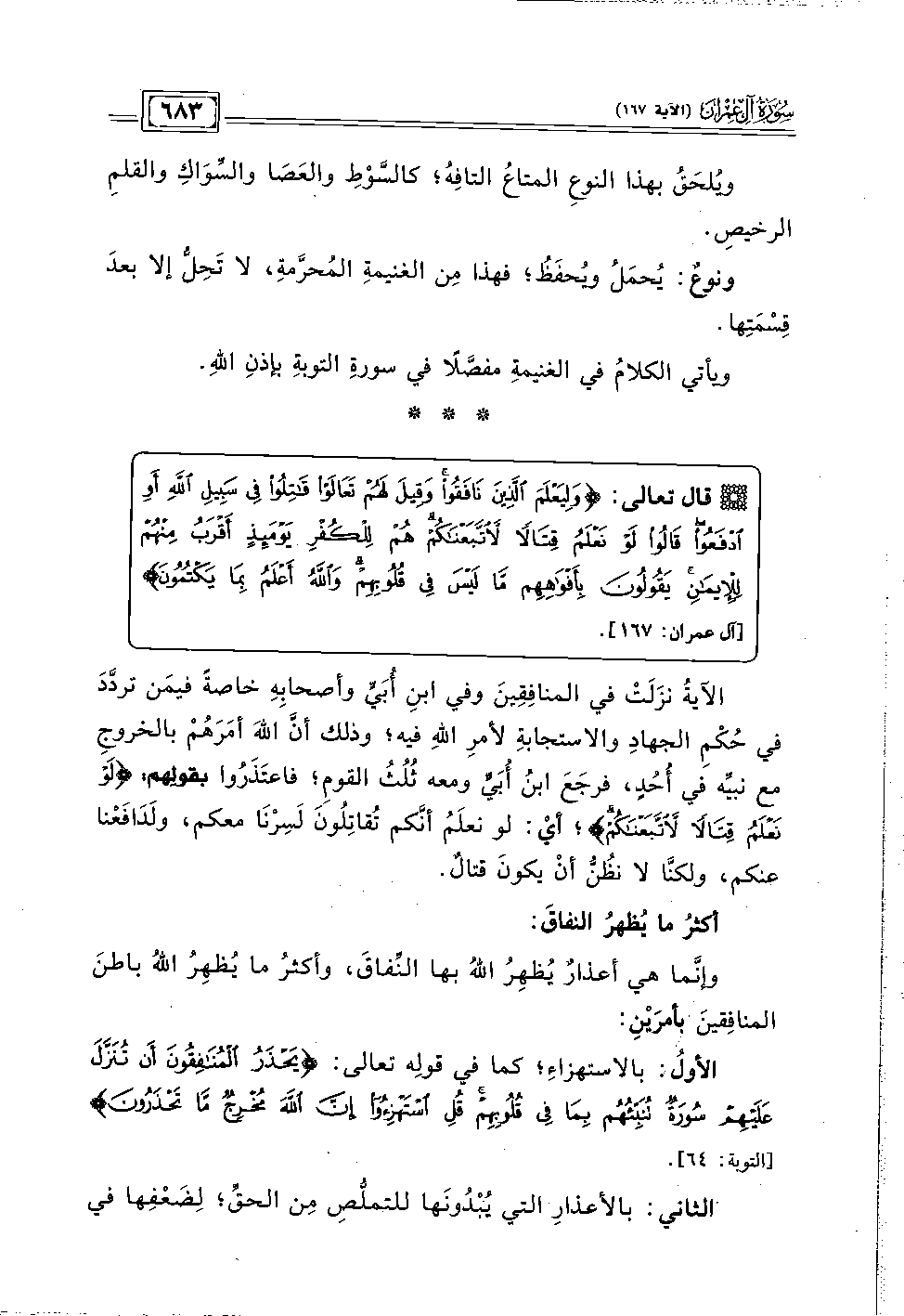 قال تعالى: {وَلِيَعْلَمَ الَّذِينَ نَافَقُوا وَقِيلَ لَهُمْ تَعَالَوْا قَاتِلُوا فِي سَبِيلِ اللَّهِ أَوِ ادْفَعُوا قَالُوا لَوْ نَعْلَمُ قِتَالًا لَاتَّبَعْنَاكُمْ هُمْ لِلْكُفْرِ يَوْمَئِذٍ أَقْرَبُ مِنْهُمْ لِلْإِيمَانِ يَقُولُونَ بِأَفْوَاهِهِمْ مَا لَيْسَ فِي قُلُوبِهِمْ وَاللَّهُ أَعْلَمُ بِمَا يَكْتُمُونَ} [آل عمران: ١٦٧].