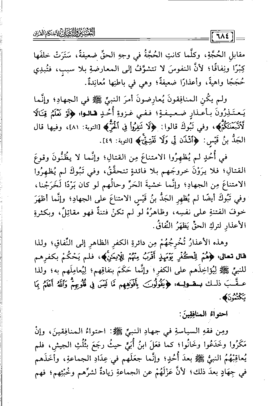 ولم يكُنِ المنافِقونَ يُعارِضونَ أمرَ النبيِّ - صلى الله عليه وسلم - في الجهادِ؛ وإنَّما يَعتَذِرُونَ بأعذارٍ ضعيفةٍ؛ ففي غزوةِ أُحُدٍ قالوا: {لَوْ نَعْلَمُ قِتَالًا لَاتَّبَعْنَاكُمْ}، وفي تَبُوكَ قالوا: {لَا تَنْفِرُوا فِي الْحَرِّ} [التوبة: ٨١]، وفيها قال الجَدُّ بنُ قَيْسٍ: {ائْذَنْ لِي وَلَا تَفْتِنِّي} [التوبة: ٤٩].