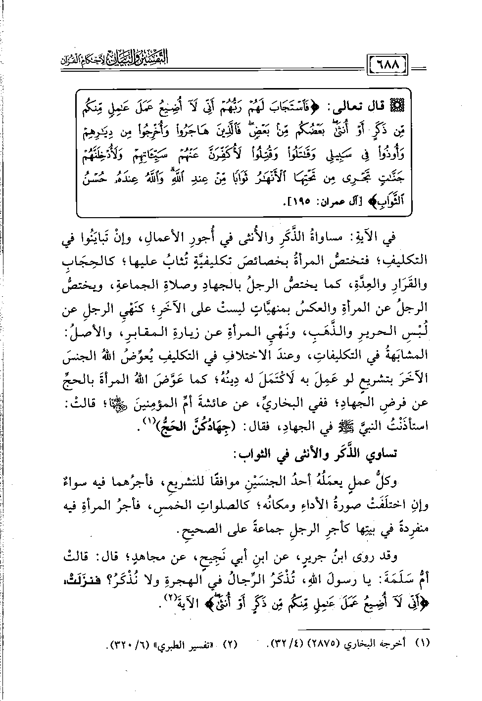 في الآيةِ: مساواةُ الذَّكَرِ والأُنثى في أُجورِ الأعمال، وإنْ تَبايَنُوا في التكليفِ؛ فتختصُّ المرأةُ بخصائصَ تكليفيَّةٍ تُثابُ عليها؛ كالحِجَابِ والقَرَارِ والعِدَّة، كما يختصُّ الرجلُ بالجهادِ وصلاةِ الجماعة، ويختصُّ الرجلُ عن المرأةِ والعكسُ بمنهيَّاتٍ ليستْ على الآخَرِ؛ كنَهْيِ الرجلِ عن لُبْسِ الحريرِ والذَّهَب، ونَهْيِ المرأةِ عن زيارةِ المقابر، والأصلُ: المشابَهةُ في التكليفات، وعندَ الاختلافِ في التكليفِ يُعوِّضُ اللهُ الجنسَ الآخَرَ بتشريعٍ لو عَمِلَ به لَاكْتَمَلَ له دِينُهُ؛ كما عَوَّضَ اللهُ المرأةَ بالحجِّ عن فرضِ الجهادِ؛ ففي البخاريِّ، عن عائشةَ أمِّ المؤمِنينَ - رضي الله عنها -؛ قالتْ: استأذَنْتُ النبيَّ - صلى الله عليه وسلم - في الجهاد، فقال: (جِهَادُكُنَّ الحَجُّ) (١).