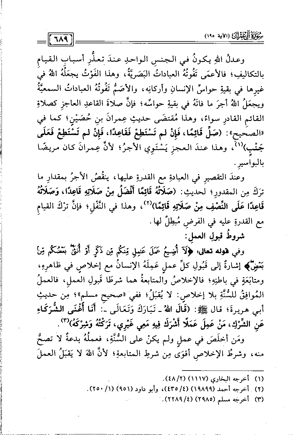 وفي قوله تعالى: {لَا أُضِيعُ عَمَلَ عَامِلٍ مِنْكُمْ مِنْ ذَكَرٍ أَوْ أُنْثَى بَعْضُكُمْ مِنْ بَعْضٍ} إشارةٌ إلى قَبُولِ كلِّ عملٍ عَمِلَهُ الإنسانُ مع إخلاصٍ في ظاهرِه، ومتابَعَةٍ في باطِنهِ؛ فالإخلاصُ والمتابعةُ هما شرطَا قَبولِ العمل، فالعملُ المُوافِقُ للسُّنَّةِ بلا إخلاصٍ: لا يُقبَلُ؛ ففي "صحيحِ مسلم"؛ مِن حديثِ أبي هريرةَ؛ قال - صلى الله عليه وسلم -: (قَالَ اللهُ - تَبَارَكَ وَتَعَالَى -: أَنَا أَغْنَى الشُّرَكَاءِ عَنِ الشِّرْك، مَنْ عَمِلَ عَمَلًا أَشْرَكَ فِيهِ مَعِي غَيْرِي، تَرَكْتُهُ وَشِرْكَهُ) (٣).