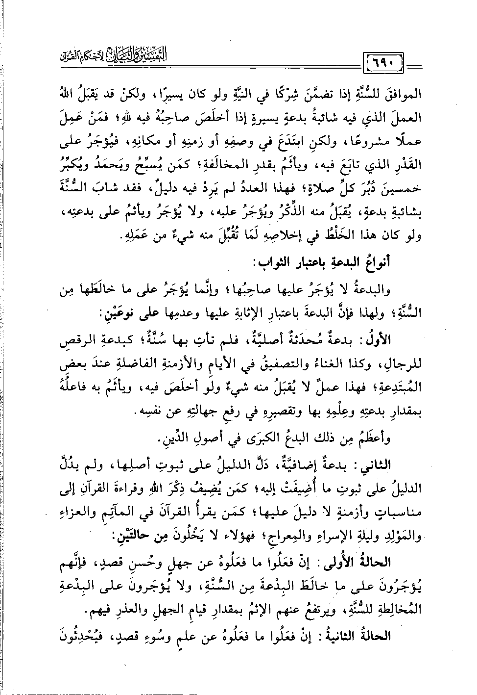 والبدعةُ لا يُؤجَرُ عليها صاحِبُها؛ وإنَّما يُؤجَرُ على ما خالَطَها مِن السُّنَّةِ؛ ولهذا فإنَّ البدعةَ باعتبارِ الإثابةِ عليها وعدمِها على نوعَيْنِ: