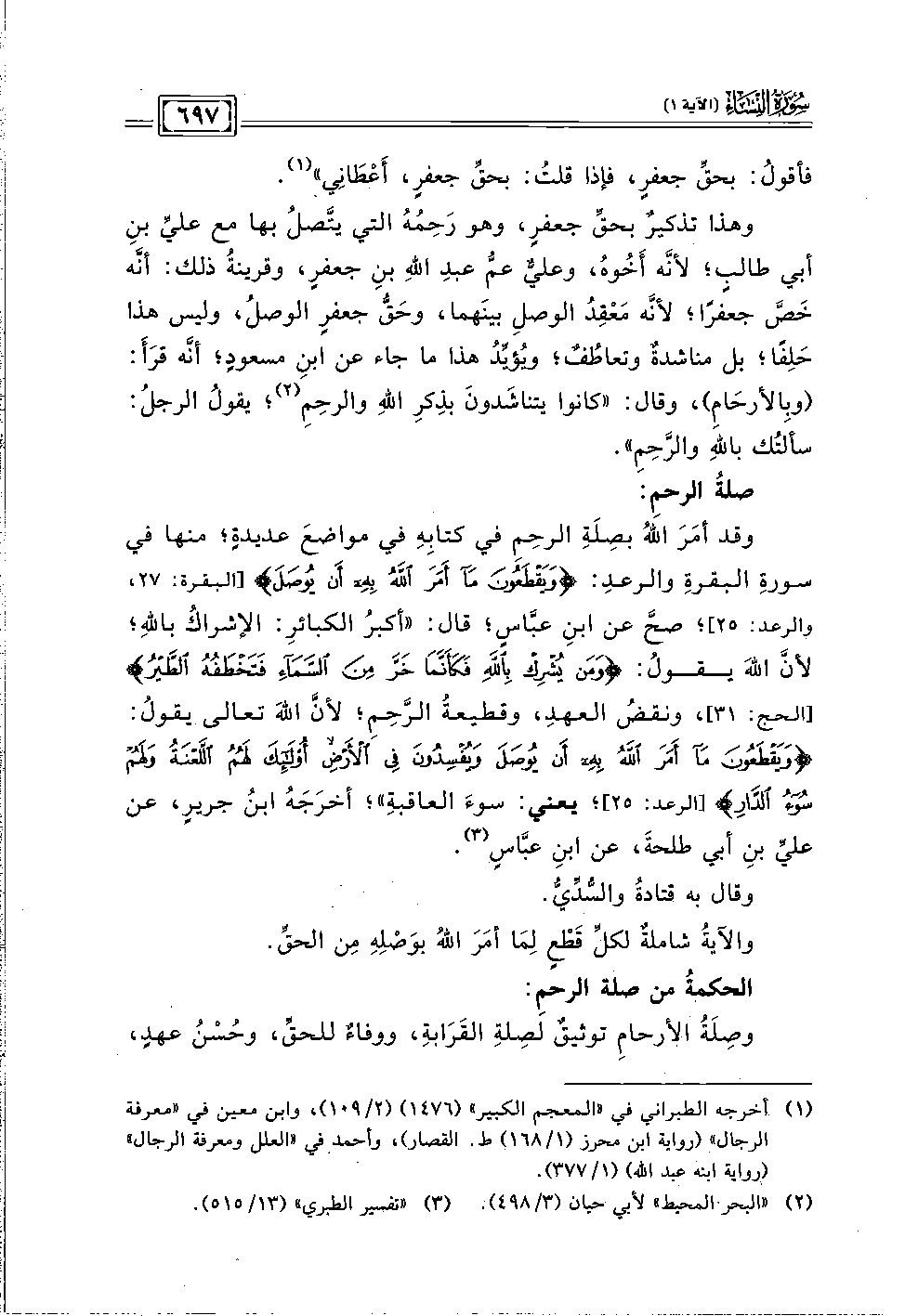 وهذا تذكيرٌ بحقِّ جعفرٍ، وهو رَحِمُهُ التي يتَّصلُ بها مع عليِّ بنِ أبي طالبٍ؛ لأنَّه أَخُوهُ، وعليٌّ عمُّ عبدِ اللهِ بنِ جعفرٍ, وقرينةُ ذلك: أنَّه خَصَّ جعفرًا؛ لأنَّه مَعْقِدُ الوصلِ بينَهما، وحَقُّ جعفرٍ الوصلُ، وليس هذا حَلِفًا؛ بل مناشدةٌ وتعاطُفٌ؛ ويُؤيِّدُ هذا ما جاء عن ابنِ مسعودٍ؛ أنَّه قرَأَ: (وبِالأرحَامِ)، وقال: "كانوا يتناشَدونَ بذِكرِ اللهِ والرحِمِ (٢)؛ يقولُ الرجلُ: سألتُك باللهِ والرَّحِمِ".