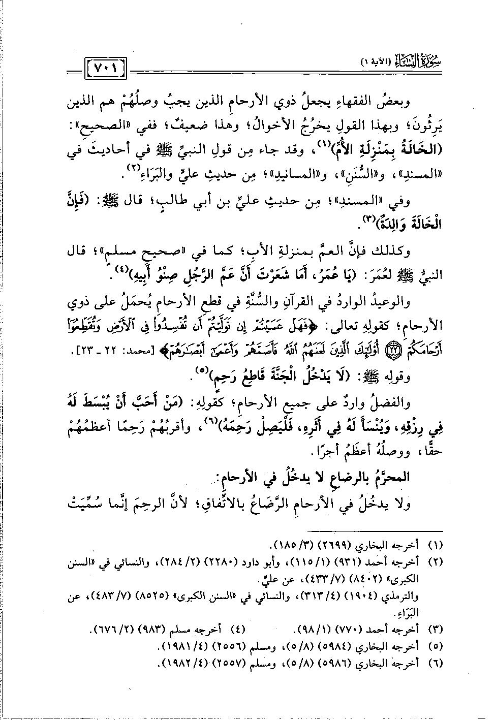 والفضلُ واردٌ على جميع الأرحامِ؛ كقولِهِ: (مَنْ أَحَبَّ أَنْ يُبْسَطَ لَهُ فِي رِزْقِه، وَيُنْسَأَ لَهُ فِي أَثَرِه، فَلْيَصِلْ رَحِمَهُ) (٦)، وأقربُهُمْ رَحِمًا أعظمُهُمْ حقًّا، ووصلُهُ أعظَمُ أجرًا.