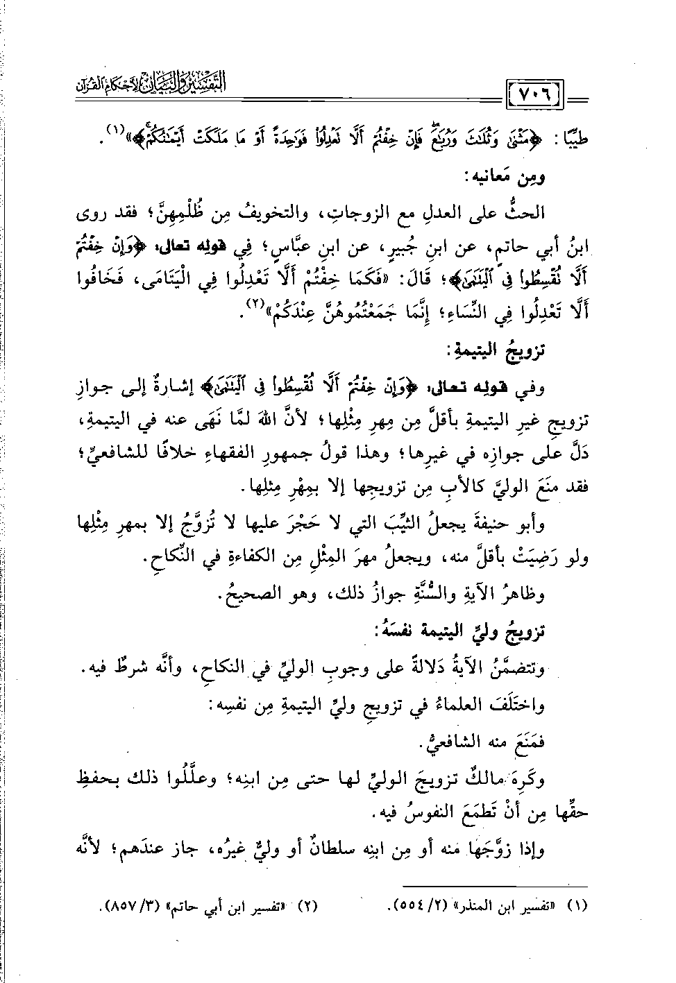 الحثُّ على العدلِ مع الزوجات، والتخويفُ مِن ظُلْمِهِنَّ؛ فقد روى ابنُ أبي حاتمٍ، عن ابنِ جُبيرٍ، عن ابنِ عبَّاسٍ؛ فِي قولِه تعالى: {وَإِنْ خِفْتُمْ أَلَّا تُقْسِطُوا فِي الْيَتَامَى}؛ قَالَ: "فَكَمَا خِفْتُمْ أَلَّا تَعْدِلُوا فِي الْيَتَامَى، فَخَافُوا أَلَّا تَعْدِلُوا فِي النِّسَاءِ؛ إِنَّمَا جَمَعْتُمُوهُنَّ عِنْدَكُمْ" (٢).