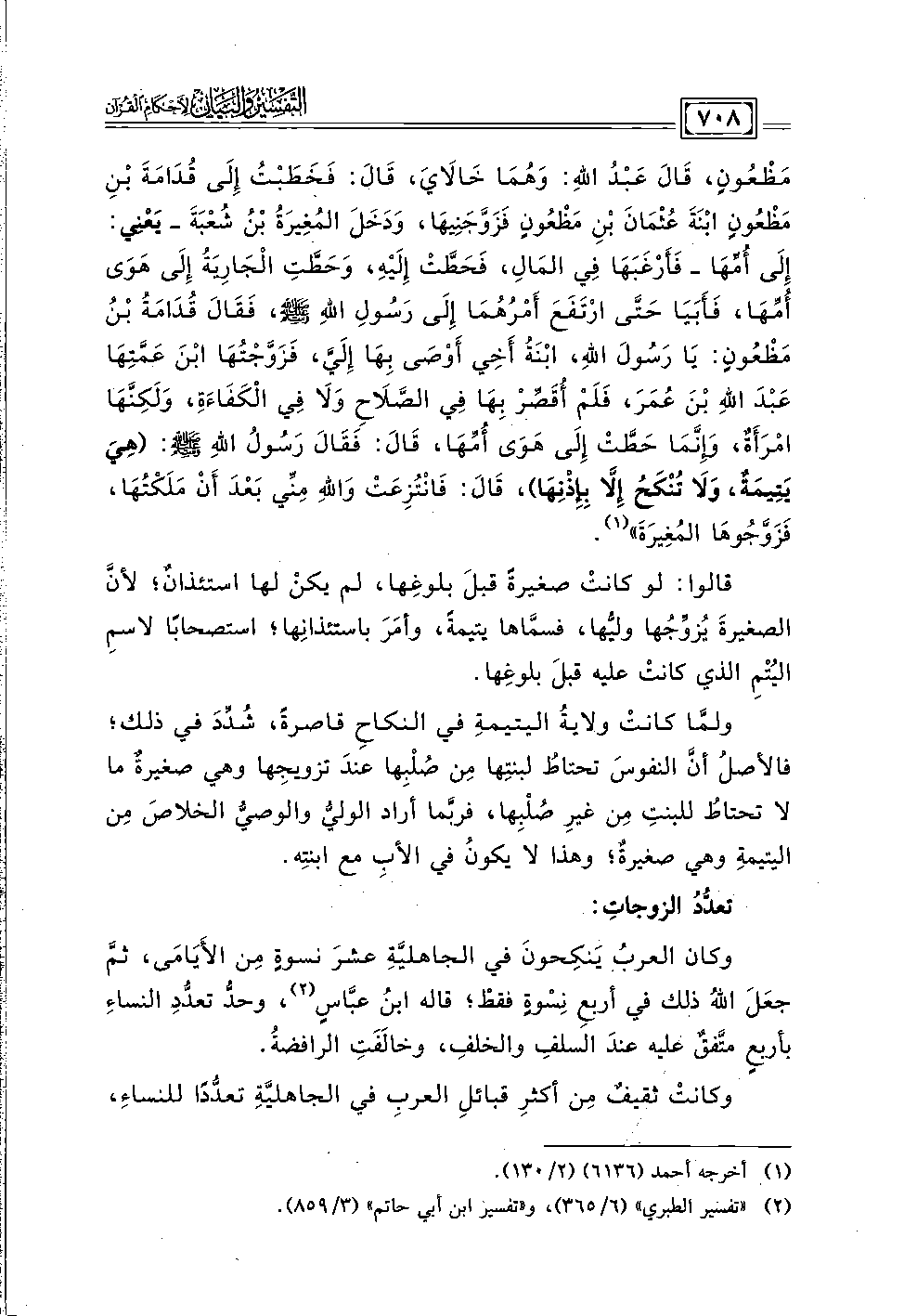 وكان العربُ يَنكِحونَ في الجاهليَّةِ عشرَ نسوةٍ مِن الأَيَامَى، ثمَّ جعَلَ اللهُ ذلك في أربعِ نِسْوةٍ فقطْ؛ قاله ابنُ عبَّاسٍ (٢)، وحدُّ تعدُّدِ النساءِ بأربعٍ متَّفقٌ عليه عندَ السلفِ والخلف، وخالَفَتِ الرافضةُ.