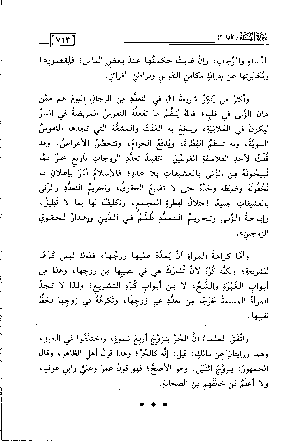 وأكثرُ مَن يُنكِرُ شريعةَ اللهِ في التعدُّدِ مِن الرجالِ اليومَ هم ممَّن هان الزِّنى في قلبِه؛ فاللهُ يُنظِّمُ ما تفعلُهُ النفوسُ المريضةُ في السرِّ ليكونَ في العَلانِيَة، ويدفَعُ به العَنَتَ والمشقَّةَ التي تجدُها النفوسُ السويَّةُ، وبه تنتظمُ الفِطْرةُ، ويُدفَعُ الحرامُ، وتتحصَّنُ الأعراضُ، وقد قُلْتُ لأحدِ الفلاسفةِ الغربيِّينَ: "تقييدُ تعدُّدِ الزوجاتِ بأربعٍ خيرٌ ممَّا تُبيحُونَهُ مِن الزِّنى بالعشيقاتِ بلا عددٍ؛ فالإسلامُ أمَرَ بإعلانِ ما تُخْفُونَهُ وضبَطَه وحَدَّهُ حتى لا تضيعَ الحقوقُ، وتحريمُ التعدُّدِ والزِّنى بالعشيقاتِ جميعًا اختلالٌ لفِطْرةِ المجتمع، وتكليفٌ لها بما لا تُطِيقُ، وإباحةُ الزِّنى وتحريمُ التعدُّدِ ظُلْمٌ في الدِّينِ وإهدارٌ لحقوقِ الزوجينِ".