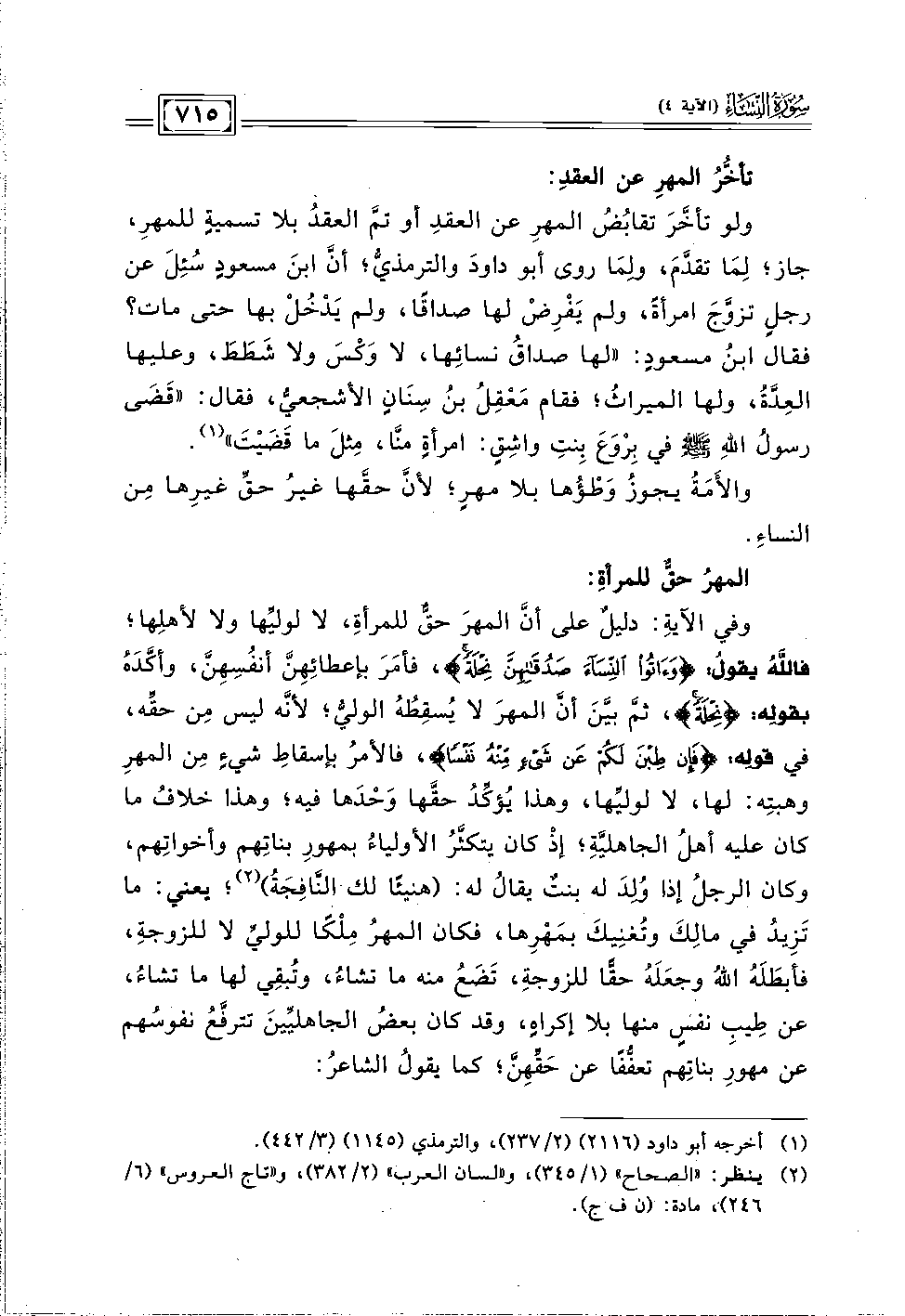 وفي الآيةِ: دليلٌ على أنَّ المهرَ حقٌّ للمرأة، لا لوليِّها ولا لأهلِها؛ فاللهُ يقولُ: {وَآتُوا النِّسَاءَ صَدُقَاتِهِنَّ نِحْلَةً}، فأمَرَ بإعطائِهِنَّ أنفُسِهِنَّ، وأكَّدَهُ بقولِه: {نِحْلَةً}، ثمَّ بيَّنَ أنَّ المهرَ لا يُسقِطُهُ الوليُّ؛ لأنَّه ليس مِن حقِّه، في قولِه: {فَإِنْ طِبْنَ لَكُمْ عَنْ شَيْءٍ مِنْهُ نَفْسًا}، فالأمرُ بإسقاطِ شيءٍ مِن المهرِ وهبتِه: لها، لا لوليِّها، وهذا يُؤكِّدُ حقَّها وَحْدَها فيه؛ وهذا خلافُ ما كان عليه أهل الجاهليَّةِ؛ إذْ كان يتكثَّرُ الأولياءُ بمهورِ بناتِهم وأخواتِهم، وكان الرجلُ إذا وُلِدَ له بنتٌ يقالُ له: (هنيئًا لك النَّافِجَةُ) (٢)؛ يعني: ما تَزِيدُ في مالِك وتُغنِيكَ بمَهْرِها، فكان المهرُ مِلْكًا للوليِّ لا للزوجة، فأبطَلَهُ اللهُ وجعَلَهُ حقًّا للزوجة، تَضَعُ منه ما تشاءُ، وتُبقِي لها ما تشاءُ، عن طِيبِ نفسٍ منها بلا إكراهٍ، وقد كان بعضُ الجاهليِّينَ تترفَّعُ نفوسُهم عن مهورِ بناتِهم تعفُّفًا عن حَقِّهِنَّ؛ كما يقولُ الشاعرُ: