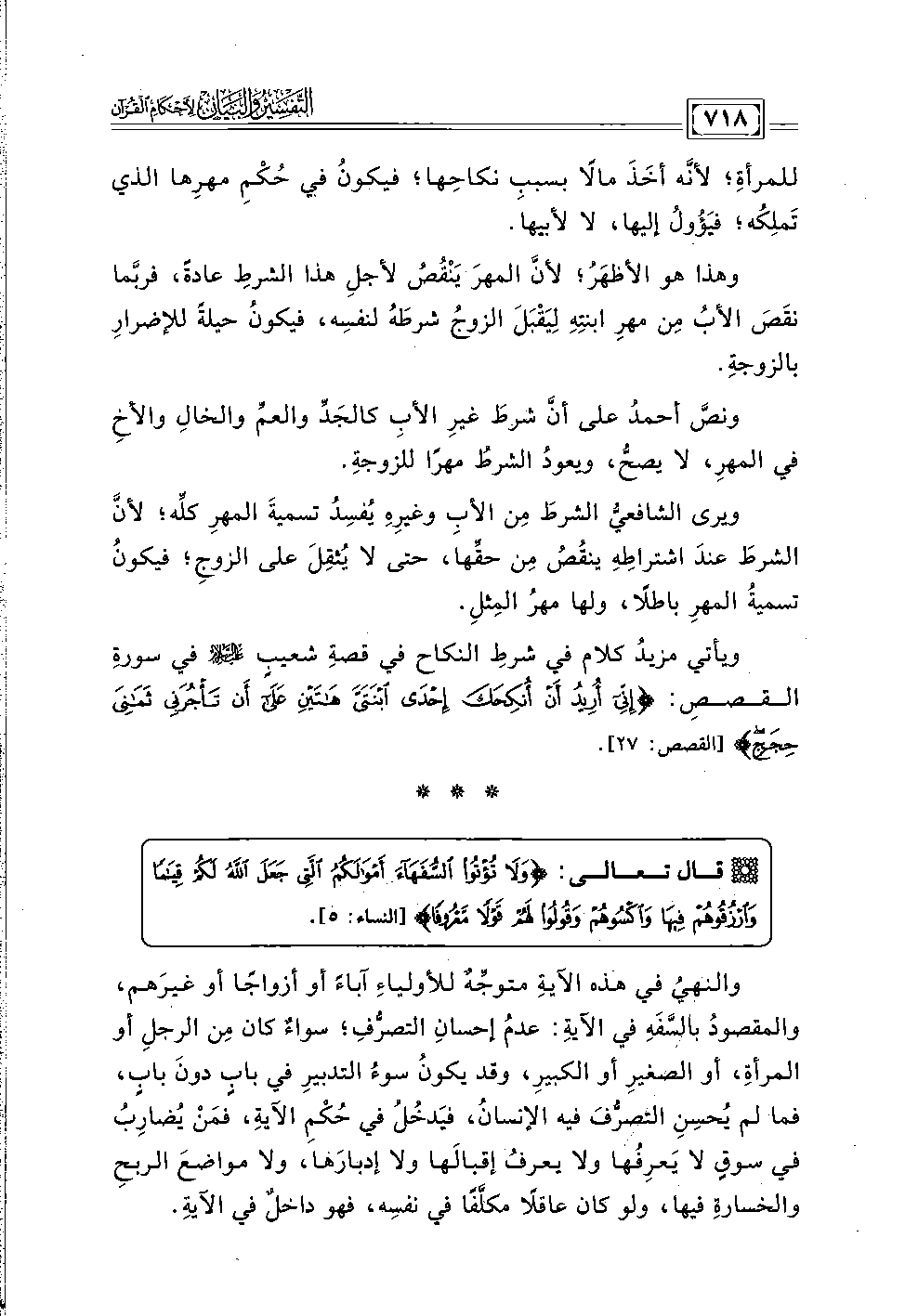والنهيُ في هذه الآيةِ متوجِّهٌ للأولياءِ آباءً أو أزواجًا أو غيرَهم، والمقصودُ بالسَّفَهِ في الآيةِ: عدمُ إحسانِ التصرُّفِ؛ سواءٌ كان مِن الرجلِ أو المرأة، أو الصغيرِ أو الكبيرِ؛ وقد يكونُ سوءُ التدبيرِ في بابِ دونَ بابٍ، فما لم يُحسِنِ التصرُّفَ فيه الإنسانُ، يَدخُلُ في حُكمِ الآية، فمَن يُضارِبُ في سوقٍ لا يَعرِفها ولا يعرفُ إقبالَها ولا إدبارَها، ولا مواضعَ الربحِ والخسارةِ فيها، ولو كان عاقلًا مكلَّفًا في نفسِه، فهو داخلٌ في الآيةِ.