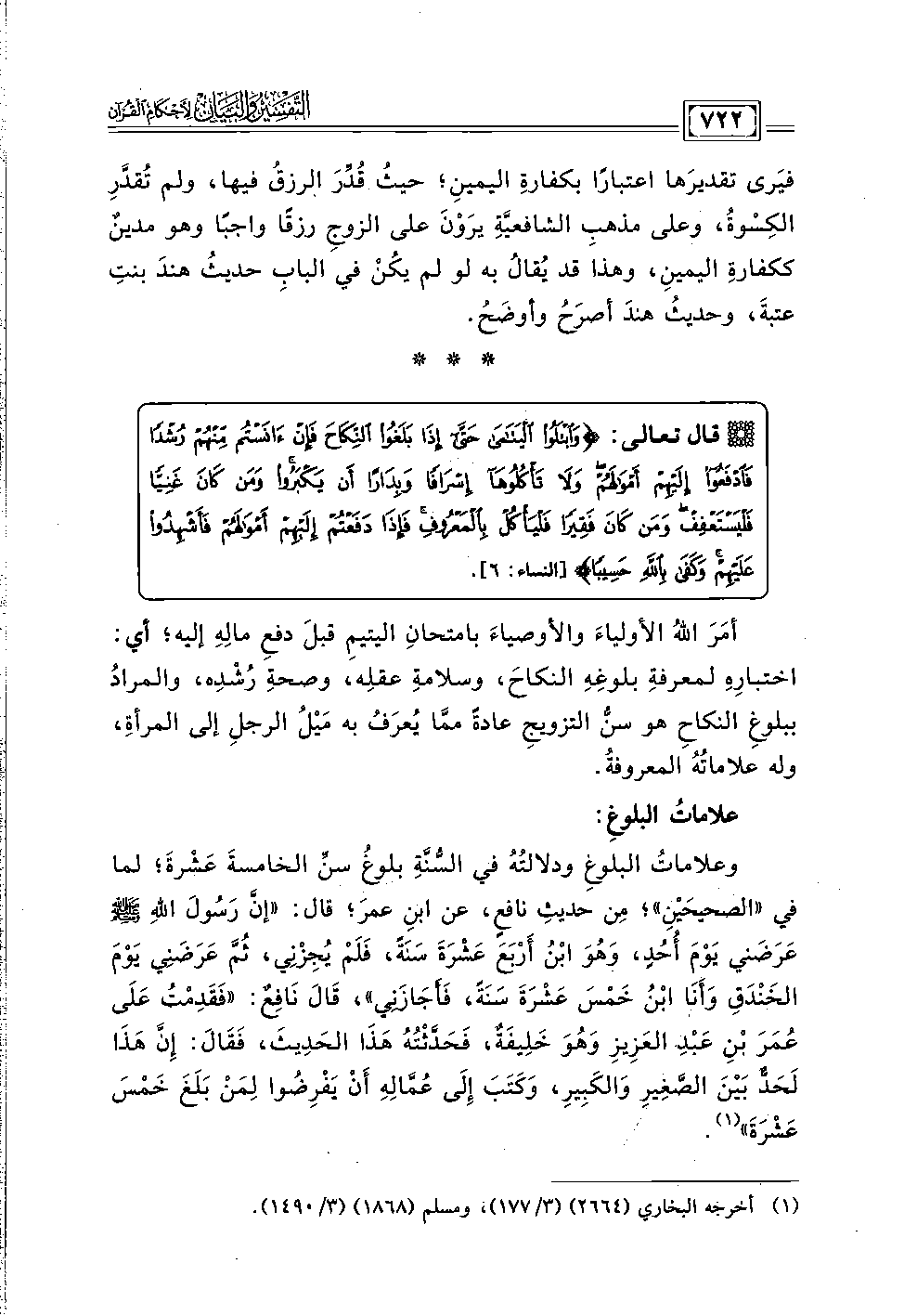 وعلاماتُ البلوغِ ودلالتُهُ في السُّنَّةِ بلوغُ سنِّ الخامسةَ عَشْرةَ؛ لما في "الصحيحَيْنِ"؛ مِن حديتِ نافعٍ، عن ابنِ عمرَ؛ قال: "إنَّ رَسُولَ اللهِ - صلى الله عليه وسلم - عَرَضَني يَوْمَ أُحُدٍ، وَهُوَ ابْنُ أَرْبَعَ عَشْرَةَ سَنَةً، فَلَمْ يُجِزنِي، ثُمَّ عَرَضَنِي يَوْمَ الخَنْدَقِ وَأنَا ابْنُ خَمْسَ عَشرَةَ سَنَةً، فَأَجَازَنِي"، قَالَ نَافِعٌ: "فَقَدِمْتُ عَلَى عُمَرَ بْنِ عَبْدِ العَزِيزِ وَهُوَ خَلِيفَةٌ، فَحَدَّثْتُهُ هَذَا الحَدِيثَ، فَقَالَ: إنَّ هَذَا لَحَدٌّ بَيْنَ الصَّغِيرِ وَالكَبِيرِ، وَكَتَبَ إِلَى عُمَّالِهِ أَنْ يَفْرِضُوا لِمَن بَلَغَ خَمْسَ عَشْرَةَ" (١).