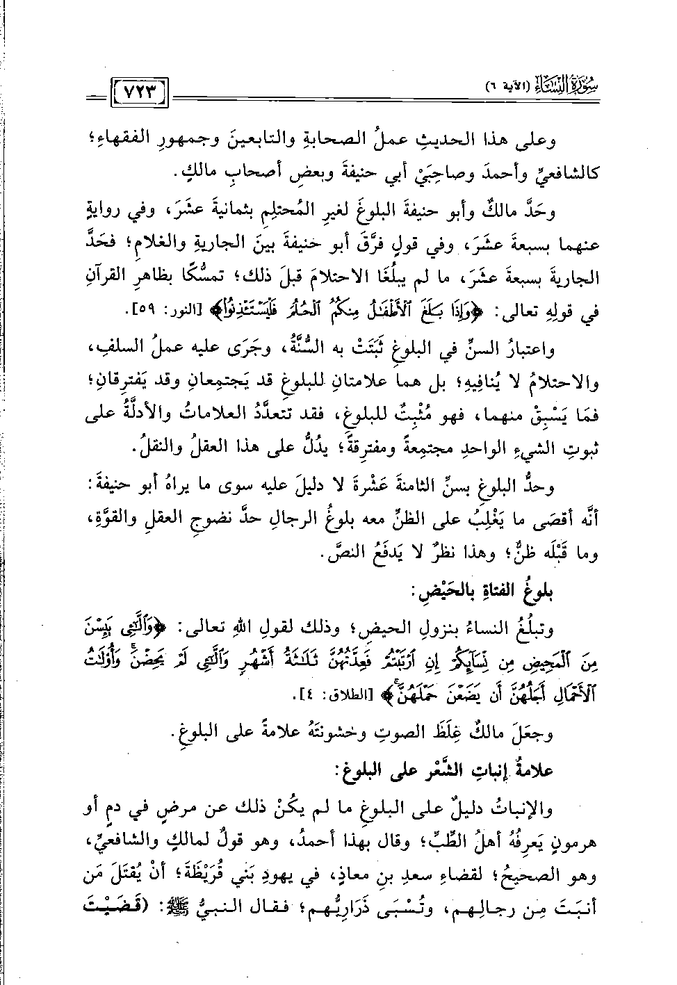 وحَدَّ مالكٌ وأبو حنيفةَ البلوغَ لغيرِ المُحتلِمِ بثمانيةَ عشَرَ، وفي روايةٍ عنهما بسبعةَ عشَرَ، وفي قولٍ فرَّقَ أبو حنيفةَ بينَ الجاريةِ والغلامِ؛ فحَدَّ الجاريةَ بسبعةَ عشَرَ، ما لم يبلُغَا الاحتلامَ قبلَ ذلك؛ تمسُّكًا بظاهرِ القرآنِ في قولِهِ تعالى: {وَإِذَا بَلَغَ الْأَطْفَالُ مِنْكُمُ الْحُلُمَ فَلْيَسْتَأْذِنُوا} [النور: ٥٩].