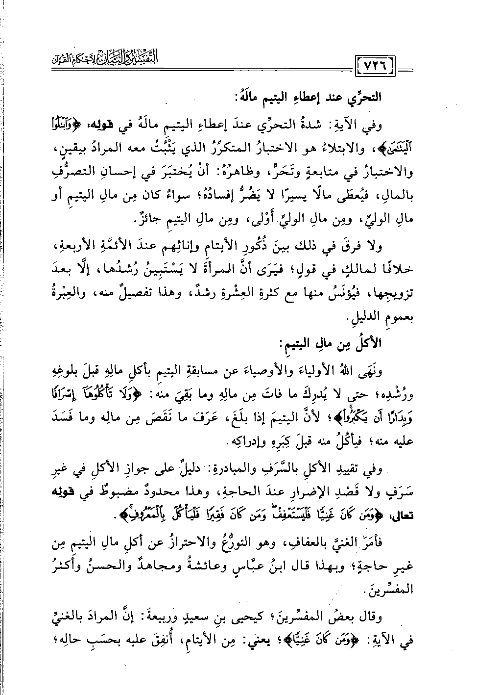 فأمَرَ الغنيَّ بالعفافِ، وهو التورُّعُ والاحترازُ عن أكلِ مالِ اليتيمِ مِن غيرِ حاجةٍ؛ وبهذا قال ابنُ عبَّاسٍ وعائشةُ ومجاهدٌ والحسنُ وأَكثرُ المفسِّرينَ.