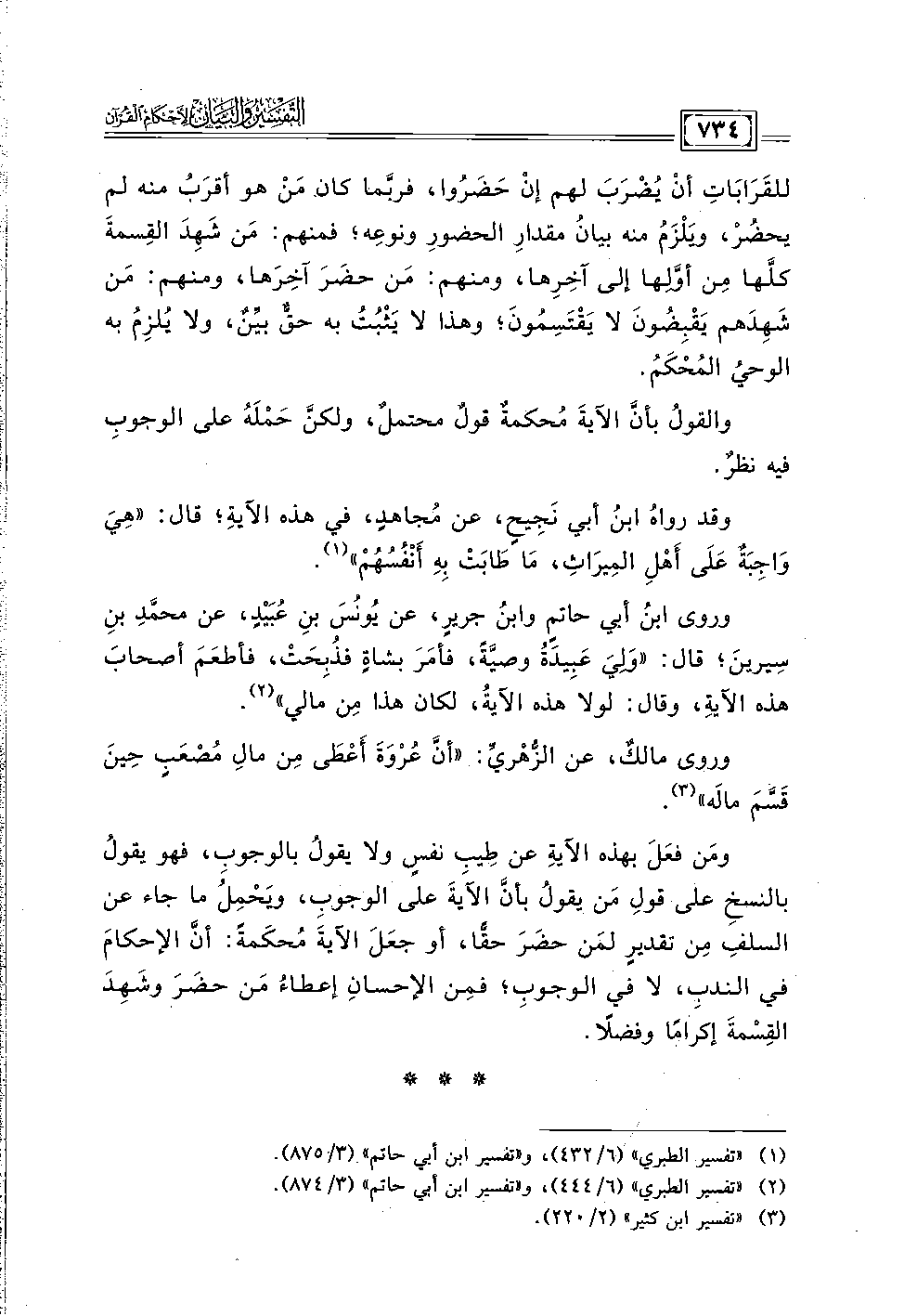 ومَن فعَلَ بهذه الآيةِ عن طِيبِ نفسٍ ولا يقولُ بالوجوب، فهو يقولُ بالنسخِ على قولِ مَن يقولُ بأنَّ الآَيةَ على الوجوب، وَيحْمِل ما جاء عن السلفِ مِن تقديرٍ لمَن حضَرَ حقًّا، أو جعَلَ الآيةَ مُحكَمةً: أنَّ الإحكامَ في الندب، لا في الوجوبِ؛ فمِن الإحسانِ إعطاءُ مَن حضَرَ وشَهِدَ القِسْمةَ إكرامًا وفضلًا.