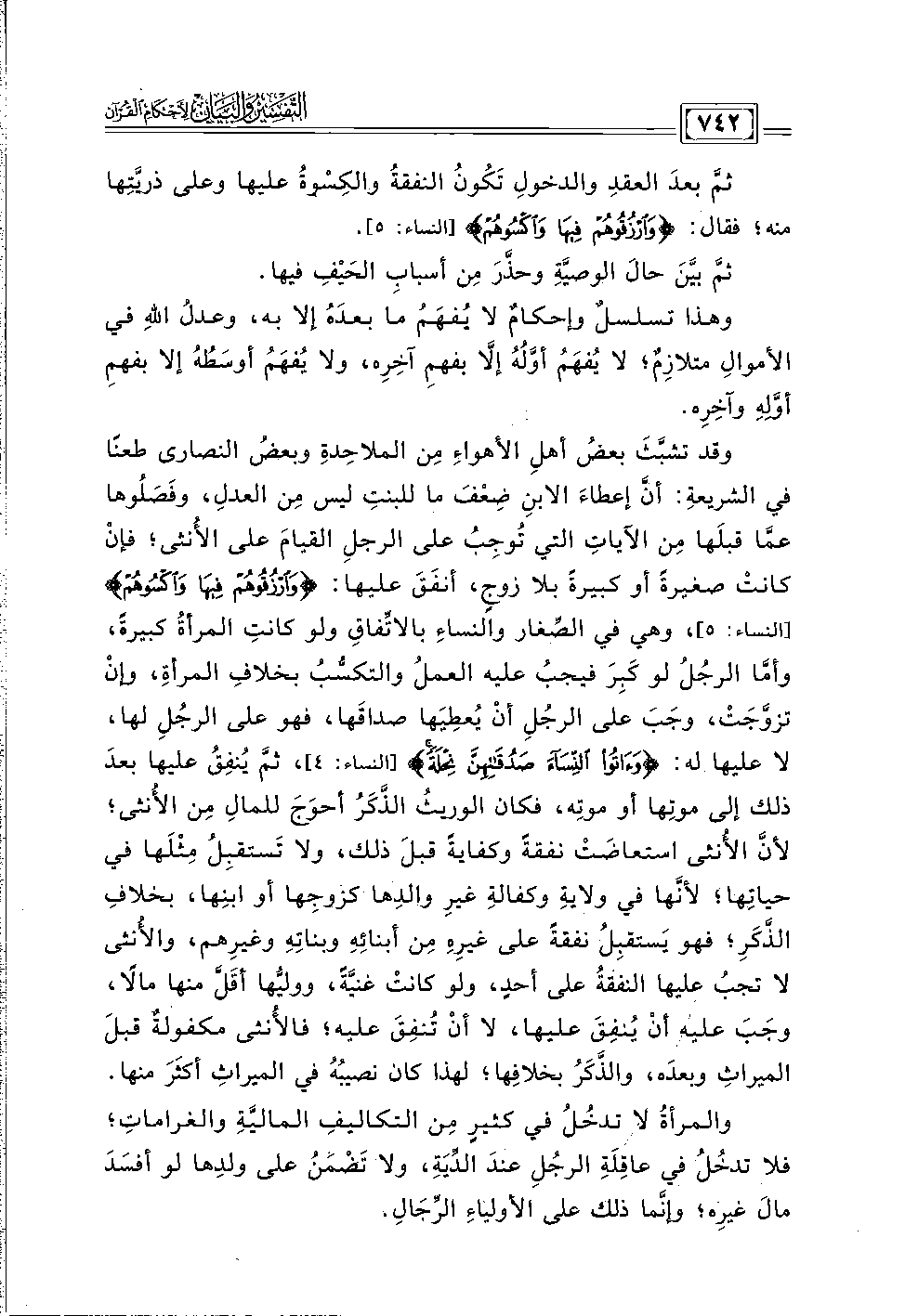 وقد تشبَّثَ بعضُ أهلِ الأهواءِ مِن الملاحِدةِ وبعضُ النصارى طعنًا في الشريعةِ: أنَّ إعطاءَ الابنِ ضِعْفَ ما للبنتِ ليس مِن العدل، وفَصَلُوها عمَّا قبلَها بن الآياتِ التي تُوجِبُ على الرجلِ القيامَ على الأُنثى؛ فإنْ كانتْ صغيرةً أو كبيرةً بلا زوجٍ، أنفَقَ عليها: {وَارْزُقُوهُمْ فِيهَا وَاكْسُوهُمْ} [النساء: ٥]، وهي في الصِّغار والنساءِ بالاتِّفاقِ ولو كانتِ المرأةُ كبيرةً، وأمَّا الرجُلُ لو كَبِرَ فيجبُ عليه العمل والتكسُّبُ بخلافِ المرأة، وإنْ تزوَّجَت، وجَبَ على الرجُلِ أنْ يُعطِيَها صداقَها، فهو على الرجُلِ لها، لا عليها له: {وَآتُوا النِّسَاءَ صَدُقَاتِهِنَّ نِحْلَةً} [النساء: ٤]، ثم يُنفِقُ عليها بعدَ ذلك إلى موتِها أو موتِه، فكان الوريثُ الذَّكَرُ أحوَجَ للمالِ مِن الأُنثى؛ لأنَّ الأُنثى استعاضَتْ نفقةً وكفايةً قبلَ ذلك، ولا تَستقبِلُ مِثْلَها في حياتِها؛ لأنَّها في ولايةِ وكفالةِ غيرِ والدِها كزوجِها أو ابنِها، بخلافِ الذَّكَرِ؛ فهو يَستقبِلُ نفقةً على غيرِهِ مِن أبنائِهِ وبناتِهِ وغيرِهم، والأُنثى لا تجبُ عليها النفقةُ على أحدٍ، ولو كانت غنيَّةً، ووليُّها أقَلَّ منها مالًا، وجَبَ عليه أنْ يُنفِقَ عليها، لا أنْ تُنفِقَ عليه؛ فالأُنثى مكفولةٌ قبلَ الميراثِ وبعدَه، والذَّكَرُ بخلافِها؛ لهذا كان نصيبُهُ في الميراثِ أكثَرَ منها.
