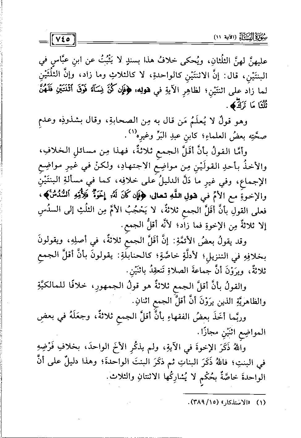 وأمَّا القولُ بأنَّ أقَلَّ الجمعِ ثلاثةٌ، فهذا مِن مسائلِ الخلافِ، والأخذُ بأحدِ القولَيْنِ مِن مواضِعِ الاجتهاد، ولكنْ في غيرِ مواضِعِ الإجماع، وفي غيرِ ما دَلَّ الدليلُ على خلافِه، كما في مسألةِ البنتَيْنِ والإخوةِ مع الأمِّ في قولِ اللهِ تعالى: {فَإِنْ كَانَ لَهُ إِخْوَةٌ فَلِأُمِّهِ السُّدُسُ}، فعلى القولِ بأنَّ أقَلَّ الجمع ثلاثةٌ، لا يَحْجُبُ الأمَّ مِن الثلُثِ إلى السدُسِ إلا ثلاثةٌ مِن الإخوةِ فما زاد؛ لأنَّه أقلُّ الجمعِ.