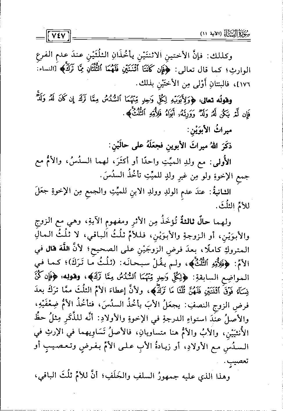وقوله تعالى: {وَلِأَبَوَيْهِ لِكُلِّ وَاحِدٍ مِنْهُمَا السُّدُسُ مِمَّا تَرَكَ إِنْ كَانَ لَهُ وَلَدٌ فَإِنْ لَمْ يَكُنْ لَهُ وَلَدٌ وَوَرِثَهُ أَبَوَاهُ فَلِأُمِّهِ الثُّلُثُ}.