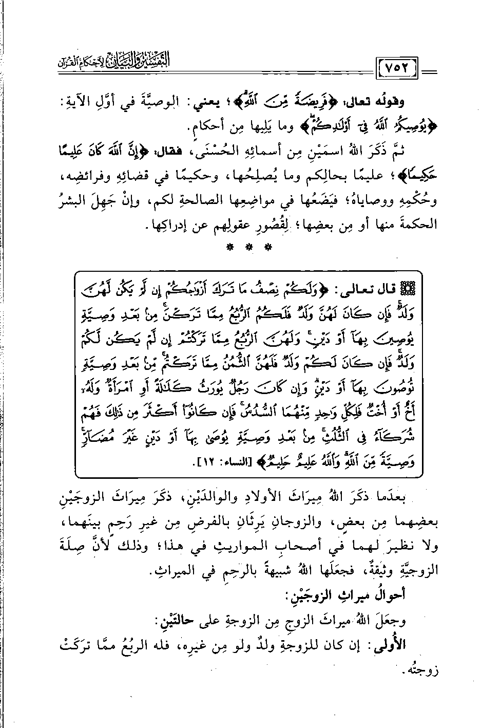 قال تعالى: {وَلَكُمْ نِصْفُ مَا تَرَكَ أَزْوَاجُكُمْ إِنْ لَمْ يَكُنْ لَهُنَّ وَلَدٌ فَإِنْ كَانَ لَهُنَّ وَلَدٌ فَلَكُمُ الرُّبُعُ مِمَّا تَرَكْنَ مِنْ بَعْدِ وَصِيَّةٍ يُوصِينَ بِهَا أَوْ دَيْنٍ وَلَهُنَّ الرُّبُعُ مِمَّا تَرَكْتُمْ إِنْ لَمْ يَكُنْ لَكُمْ وَلَدٌ فَإِنْ كَانَ لَكُمْ وَلَدٌ فَلَهُنَّ الثُّمُنُ مِمَّا تَرَكْتُمْ مِنْ بَعْدِ وَصِيَّةٍ تُوصُونَ بِهَا أَوْ دَيْنٍ وَإِنْ كَانَ رَجُلٌ يُورَثُ كَلَالَةً أَوِ امْرَأَةٌ وَلَهُ أَخٌ أَوْ أُخْتٌ فَلِكُلِّ وَاحِدٍ مِنْهُمَا السُّدُسُ فَإِنْ كَانُوا أَكْثَرَ مِنْ ذَلِكَ فَهُمْ شُرَكَاءُ فِي الثُّلُثِ مِنْ بَعْدِ وَصِيَّةٍ يُوصَى بِهَا أَوْ دَيْنٍ غَيْرَ مُضَارٍّ وَصِيَّةً مِنَ اللَّهِ وَاللَّهُ عَلِيمٌ حَلِيمٌ} [النساء: ١٢].
