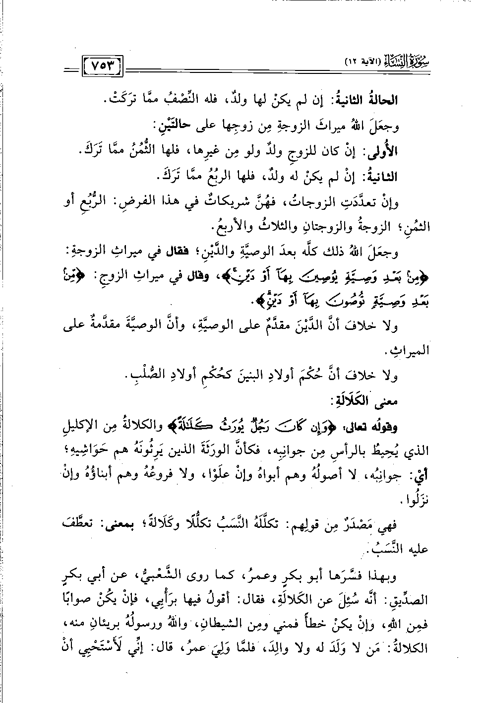 وقولُه تعالى: {وَإِنْ كَانَ رَجُلٌ يُورَثُ كَلَالَةً} والكلالةُ مِن الإكليلِ الذي يُحِيطُ بالرأسِ مِن جوانِبِه، فكأنَّ الورَثَةَ الذين يَرِثُونَهُ هم حَوَاشِيهِ؛ أيْ: جوانِبُه، لا أصولُهُ وهم أبواهُ وإنْ علَوْا، ولا فروعُهُ وهم أبناؤُهُ وإنْ نزَلُوا.