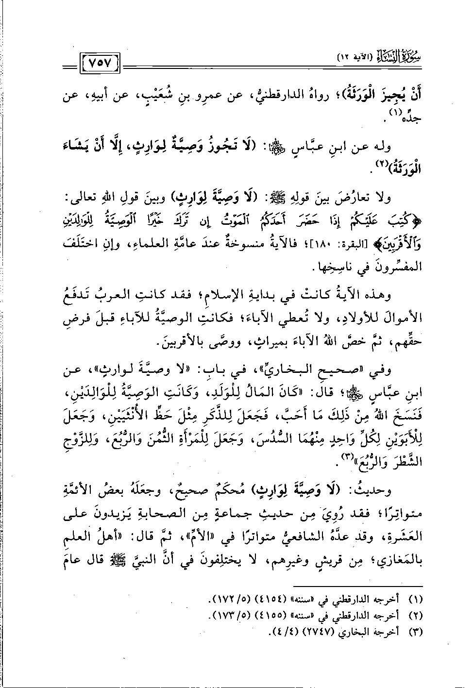 وفي "صحيحِ البخاريِّ"، في بابِ: "لا وصيَّةَ لوارثٍ"، عن ابنِ عبَّاسٍ - رضي الله عنهما -؛ قال: "كَانَ المَالُ لِلْوَلَدِ، وَكَانَتِ الوَصِيَّةُ لِلْوَالِدَيْن، فَنَسَخَ اللهُ مِنْ ذَلِكَ مَا أَحَبَّ، فَجَعَلَ لِلذَّكَرِ مِثْلَ حَظِّ الأُنْثَيَيْن، وَجَعَلَ لِلْأبَوَيْنِ لِكُلِّ وَاحِدٍ مِنْهُمَا السُّدُسَ، وَجَعَلَ لِلْمرأَةِ الثُّمُنَ وَالرُّبُعَ، وَللزَّوْجِ الشَّطْرَ وَالرُّبُعَ" (٣).