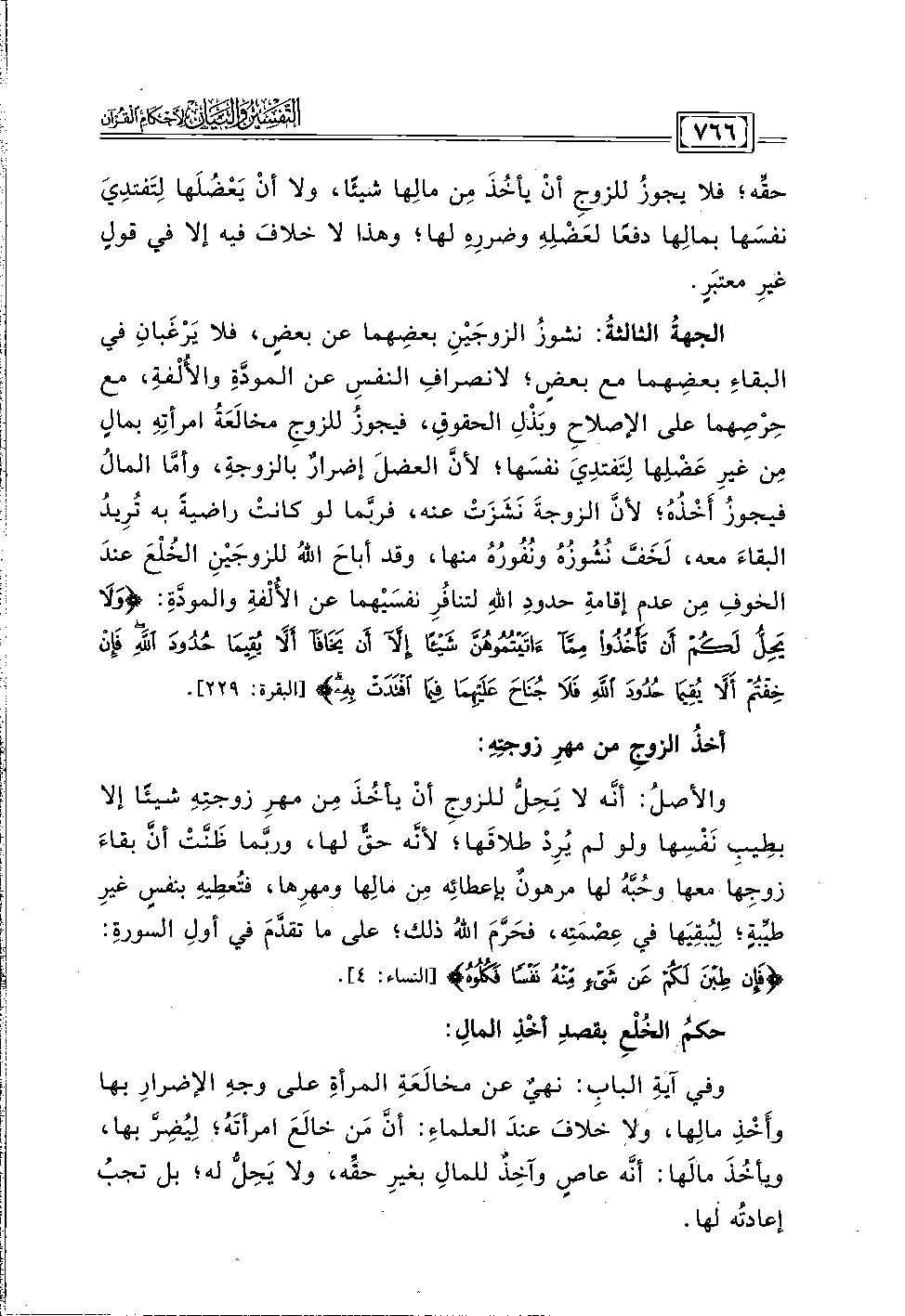 وفي آيةِ البابِ: نهيٌ عن مخالَعَةِ المرأةِ على وجهِ الإضرارِ بها وأَخْذِ مالِها، ولا خلافَ عندَ العلماءِ: أنَّ مَن خالَعَ امرأتَهُ؛ لِيُضِرَّ بها، ويأخُذَ مالَها: أنَّه عاصٍ وآخِذٌ للمالِ بغيرِ حقِّه، ولا يَحِلُّ له؛ بل تجبُ إعادتُه لها.
